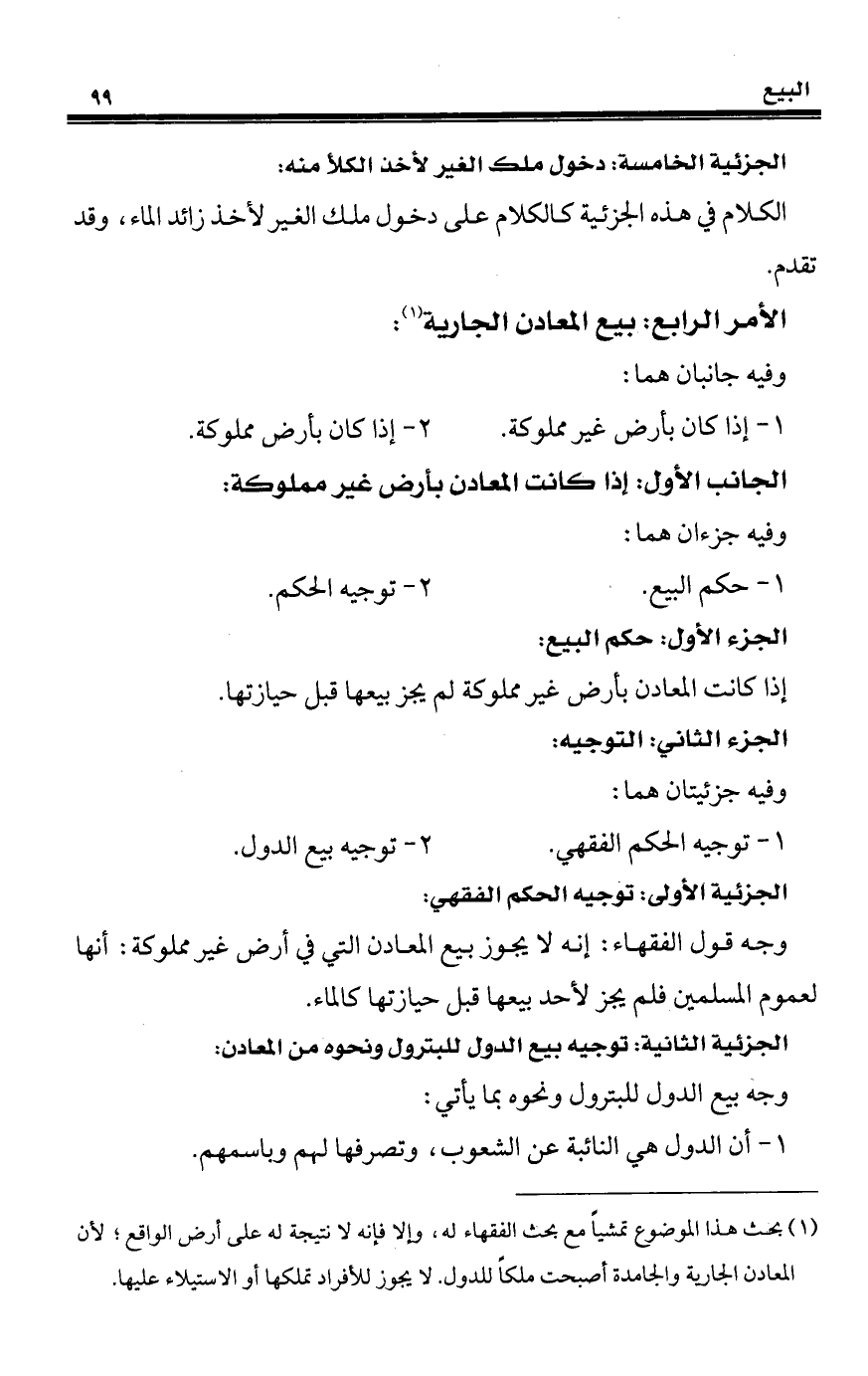 (¬1) بحث هذا الموضوع تمشيًا مع بحث الفقهاء له، وإلا فإنه لا نتيجة له على أرض الواقع؛ لأن المعادن الجارية والجامدة أصبحت ملكًا للدول. لا يجوز للأفراد تملكها أو الاستيلاء عليها.