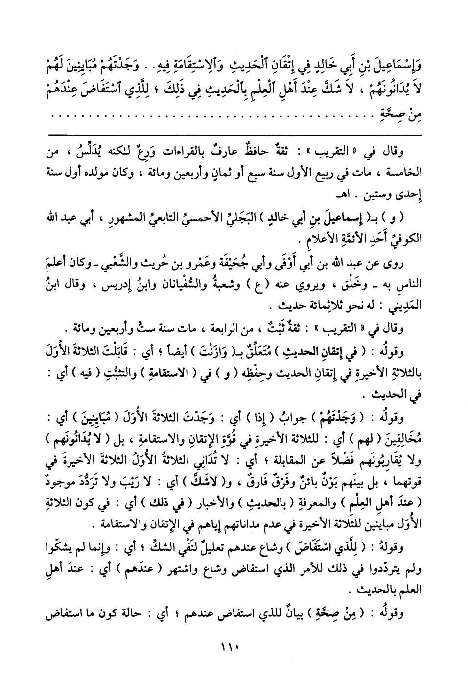 وَإِسْمَاعِيلَ بْنِ أَبِي خَالِدٍ فِي إِتْقَانِ الْحَدِيثِ وَالاسْتِقَامَةِ فِيهِ .. وَجَدْتَهُمْ مُبَايِنِينَ لَهُمْ لَا يُدَانُونَهُمْ، لَا شَكَّ عِنْدَ أَهْلِ الْعِلْمِ بِالْحَدِيثِ فِي ذَلِكَ؛ لِلَّذِي اسْتَفَاضَ عِنْدَهُمْ مِنْ صِحَّةِ