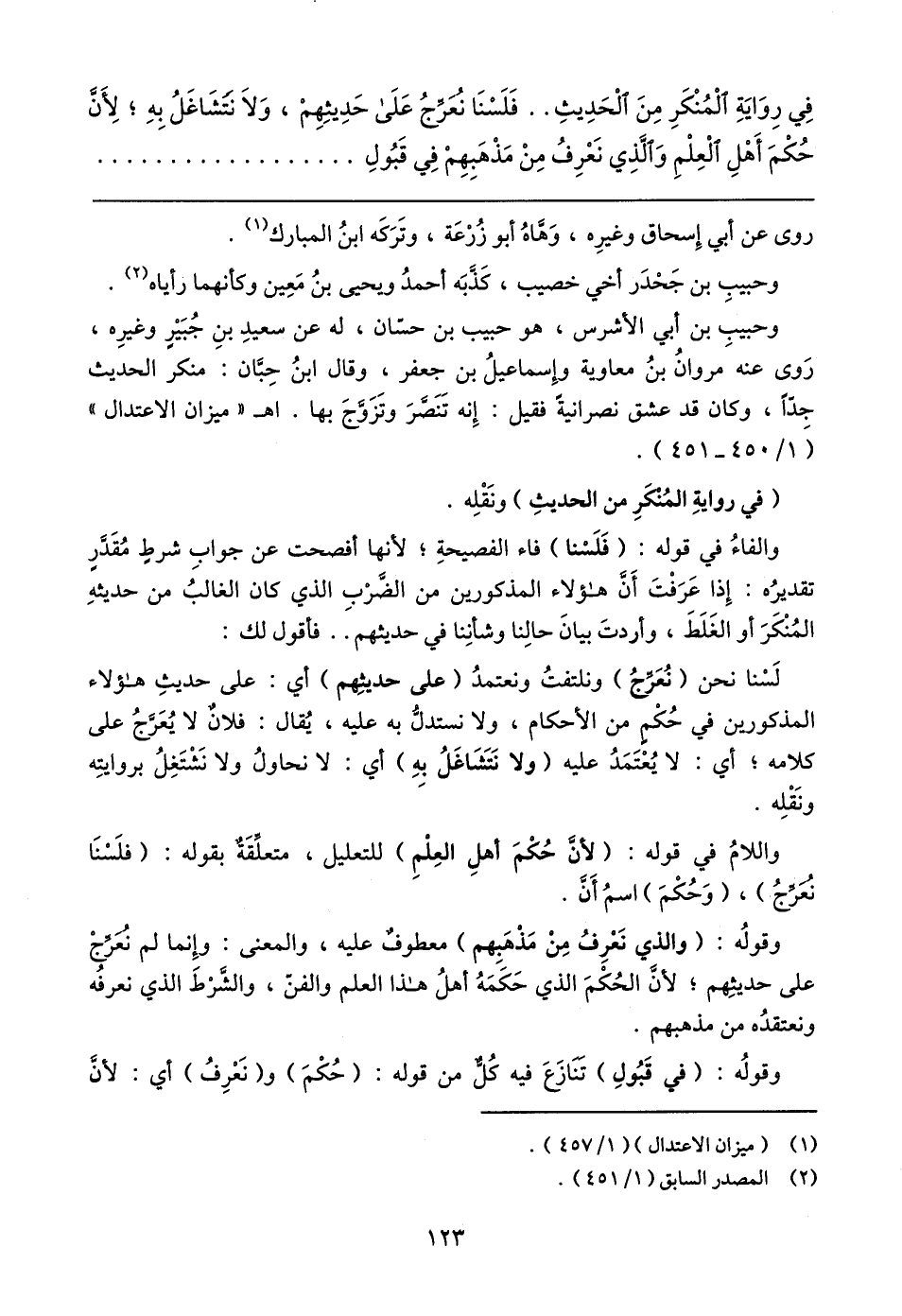 فِي رِوَايَةِ الْمُنْكَرِ مِنَ الْحَدِيثِ .. فَلَسْنَا نُعَرِّجُ عَلَى حَدِيثِهِمْ، وَلَا نَتَشَاغَلُ بِهِ؛ لِأَنَّ حُكْمَ أَهْلِ الْعِلْمِ وَالَّذِي نَعْرِفُ مِنْ مَذْهَبِهِمْ فِي قَبُولِ