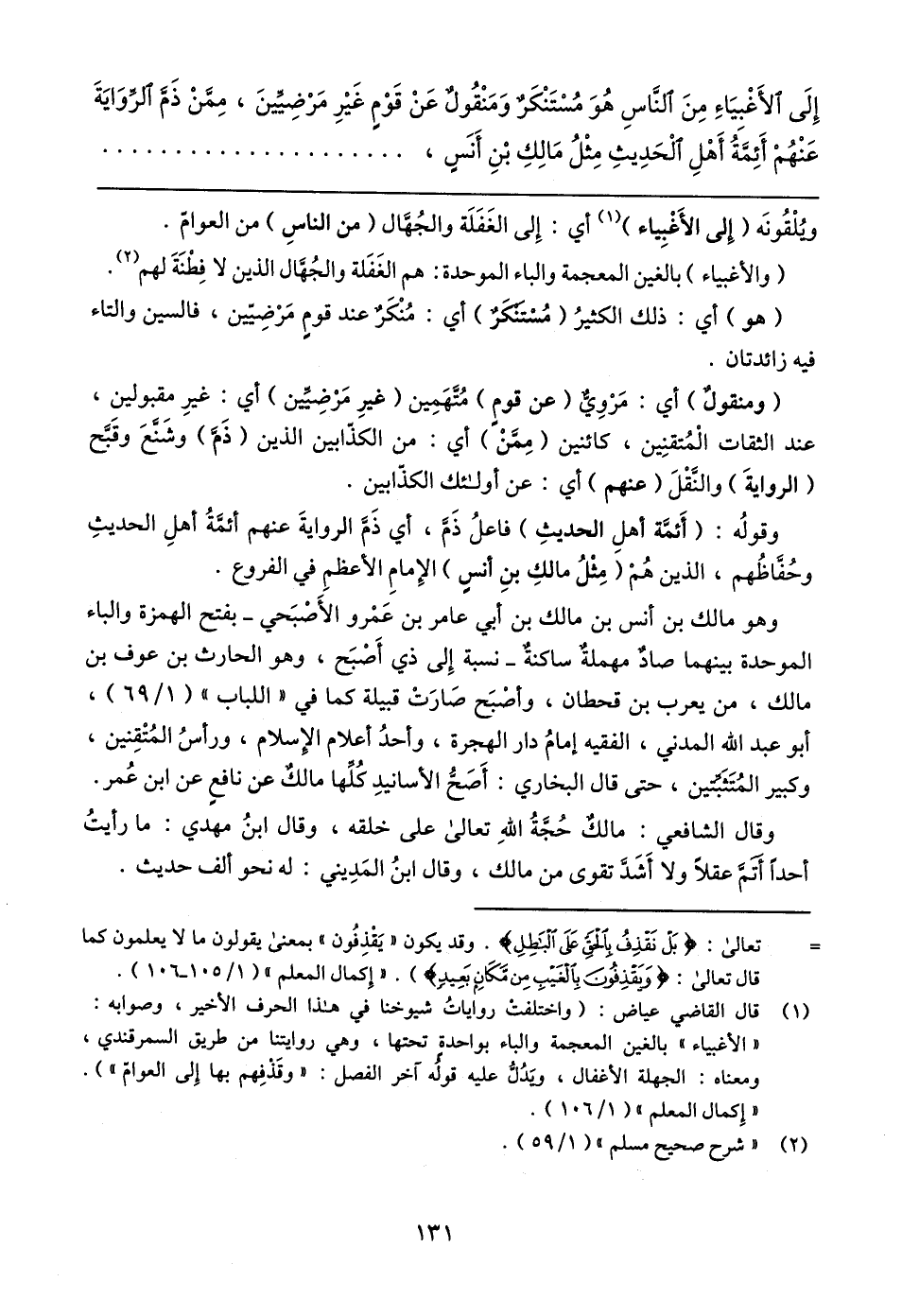 وقولُه: (أَئمَّة أهلِ الحديثِ) فاعلُ ذَمَّ، أي ذَمَّ الروايةَ عنهم أئمَّةُ أهلِ الحديثِ وحُفَّاظُهم، الذين هُمْ (مِثْلُ مالكِ بنِ أنسٍ) الإِمامِ الأعظمِ في الفروع.