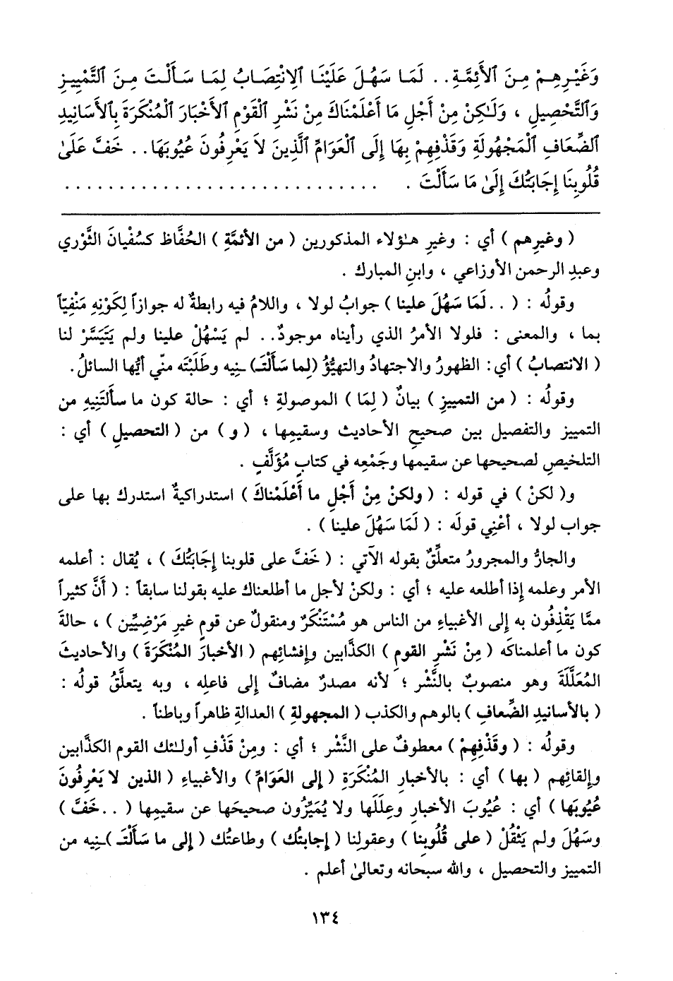 وَغَيرِهِمْ مِنَ الأَئِمَّةِ .. لَمَا سَهُلَ عَلَينَا الانْتِصَابُ لِمَا سَأَلْتَ مِنَ التَّمْيِيزِ وَالتَّحْصِيلِ، وَلكِنْ مِنْ أَجْلِ مَا أَعْلَمْنَاكَ مِنْ نَشْرِ الْقَوْمِ الأَخْبَارَ الْمُنْكَرَةَ بِالأَسَانِيدِ الضِّعَافِ الْمَجْهُولَةِ وَقَذْفِهِمْ بِهَا إِلَى الْعَوَامِّ الَّذِينَ لَا يَعْرِفُونَ عُيُوبَهَا .. خَفَّ عَلَى قُلُوبِنَا إِجَابَتُكَ إِلَى مَا سَأَلْتَ
