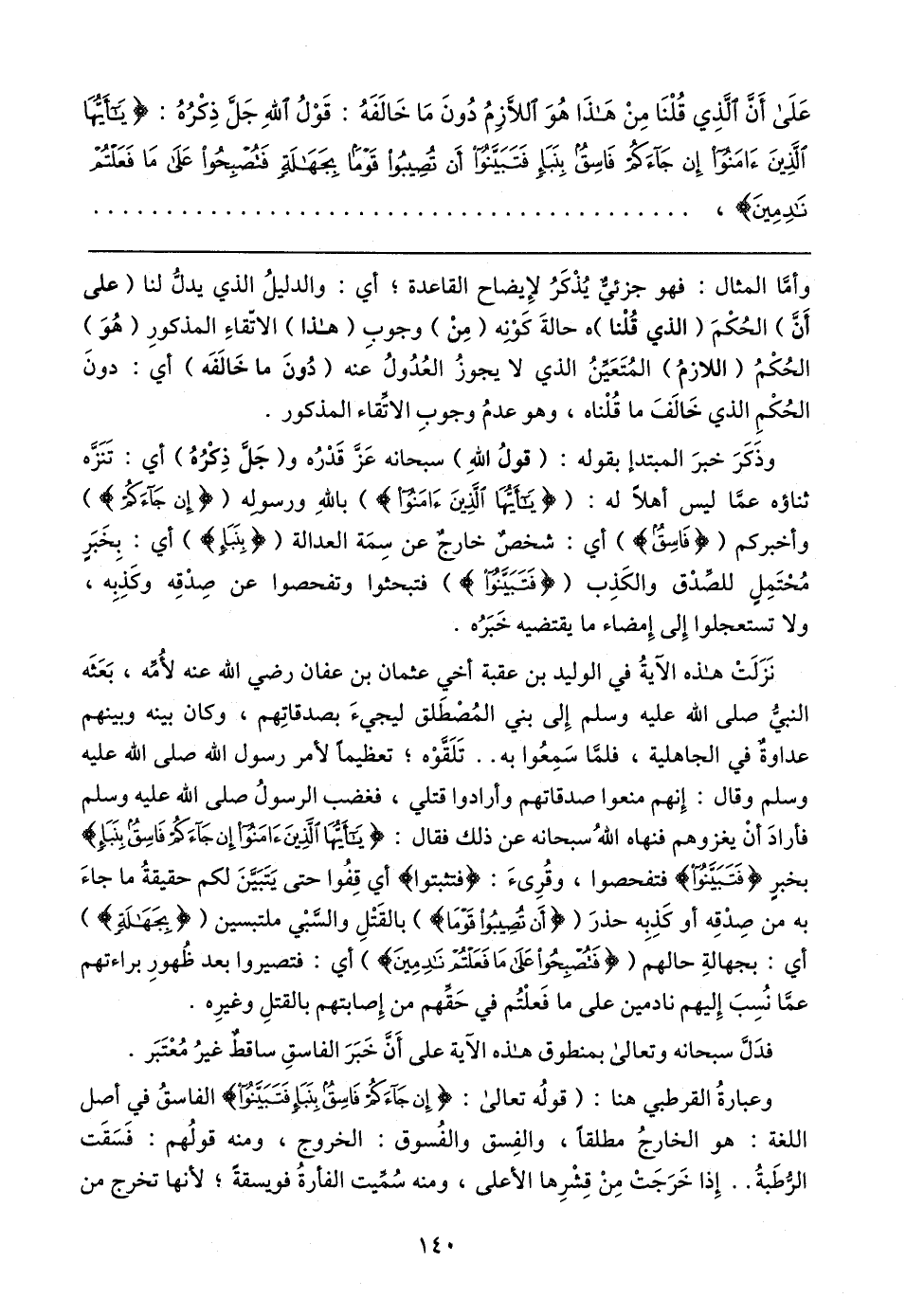 عَلَى أَنَّ الَّذِي قُلْنَا مِنْ هَذَا هُوَ اللَّازِمُ دُونَ مَا خَالفَهُ: قَوْلُ اللهِ جَلَّ ذِكْرُهُ: {يَاأَيُّهَا الَّذِينَ آمَنُوا إِنْ جَاءَكُمْ فَاسِقٌ بِنَبَإٍ فَتَبَيَّنُوا أَنْ تُصِيبُوا قَوْمًا بِجَهَالَةٍ فَتُصْبِحُوا عَلَى مَا فَعَلْتُمْ نَادِمِينَ}،