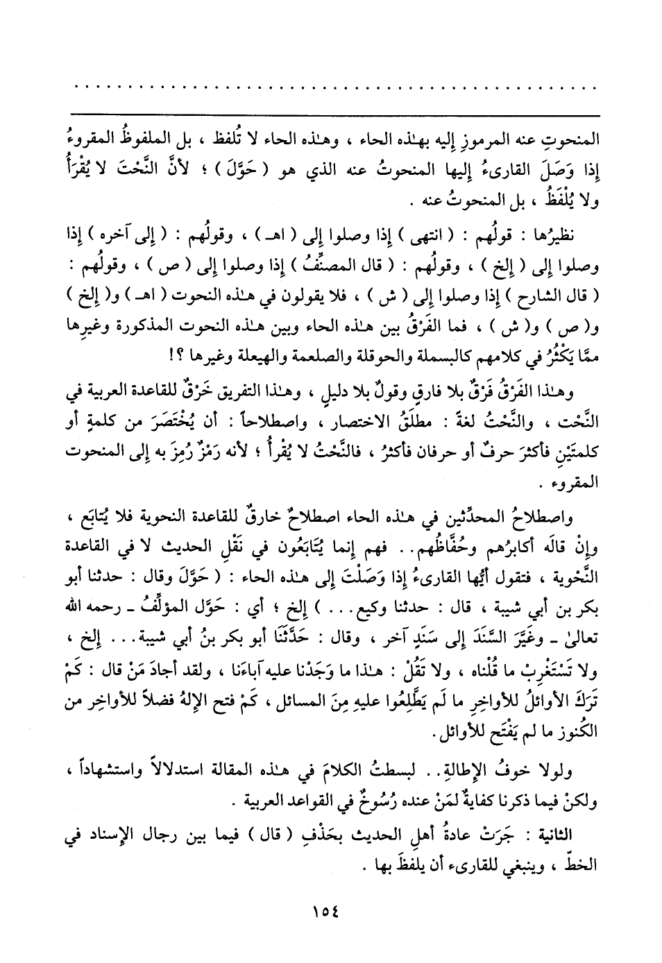 نظيرُها: قولُهم: (انتهى) إِذا وصلوا إِلى (اهـ)، وقولُهم: (إِلى آخره) إِذا وصلوا إِلى (إِلخ)، وقولُهم: (قال المصنِّفُ) إِذا وصلوا إِلى (ص)، وقولُهم: (قال الشارح) إِذا وصلوا إِلى (ش)، فلا يقولون في هذه النحوت (اهـ) و (إِلخ) و (ص) و (ش)، فما الفَرْقُ بين هذه الحاء وبين هذه النحوت المذكورة وغيرِها ممَّا يَكْثُرُ في كلامهم كالبسملة والحوقلة والصلعمة والهيعلة وغيرها؟ !