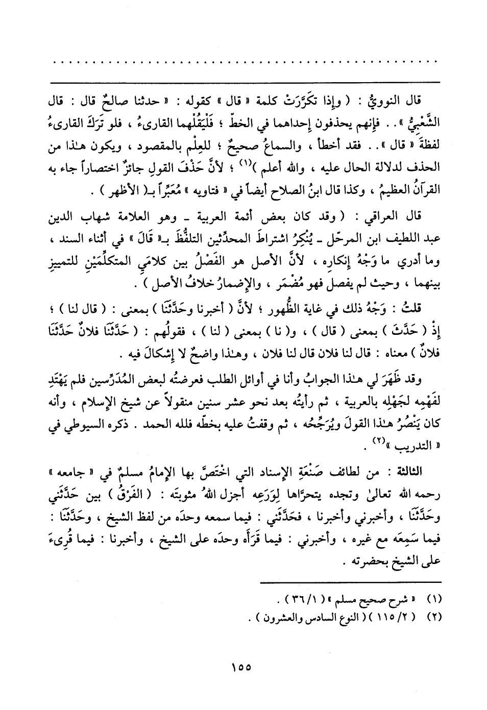 قال العراقي: (وقد كان بعض أئمة العربية -وهو العلامة شهاب الدين عبد اللطيف بن المرحّل- يُنْكِرُ اشتراطَ المحدِّثين التلفُّظَ بـ"قَال" في أثناء السند، وما أدري ما وَجْه إِنكارِه، لأن الأصل هو الفَصْلُ بين كلامَي المتكلِّمَينِ للتمييزِ بينهما، وحيث لم يفصل فهو مُضْمَر، والإِضمارُ خلافُ الأصل).