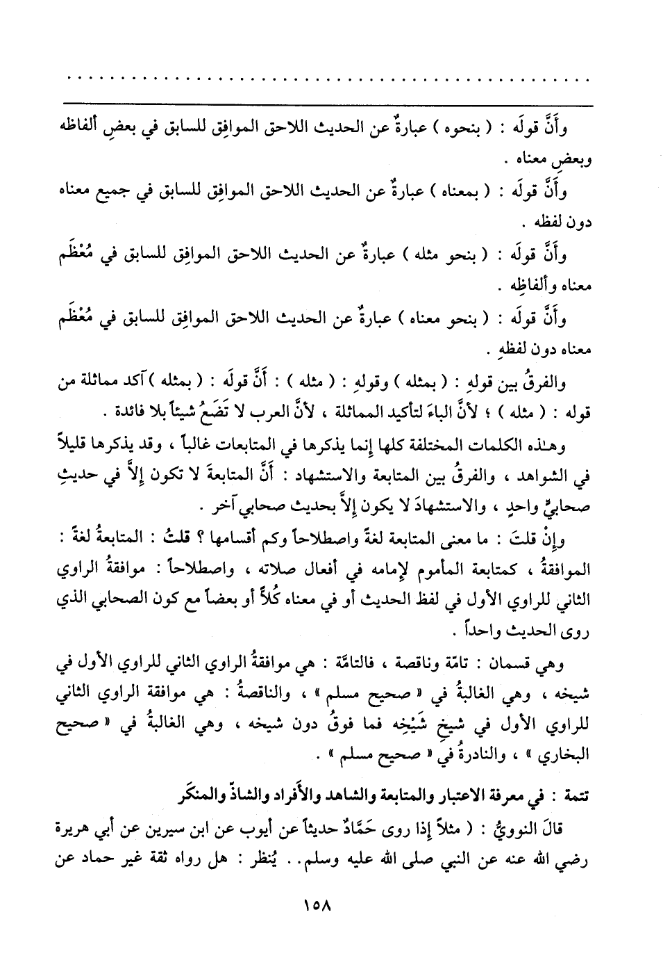 وهذه الكلمات المختلفة كلها إِنما يذكرها في المتابعات غالبا، وقد يذكرها قليلًا في الشواهد، والفرقُ بين المتابعة والاستشهاد: أَنَّ المتابعةَ لا تكون إِلَّا في حديثِ صحابيٍّ واحدٍ، والاستشهادَ لا يكون إلا بحديث صحابي آخر.