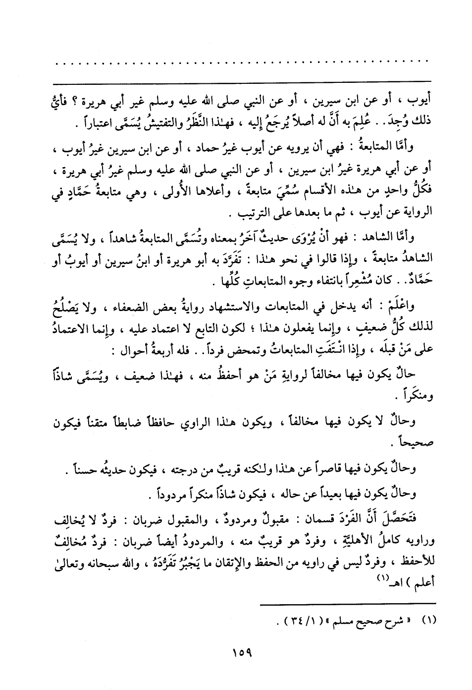 وأمَّا المتابعةُ: فهي أن يرويه عن أيوب غيرُ حماد، أو عن ابن سيرين غيرُ أيوب، أو عن أبي هريرة غيرُ ابن سيرين، أو عن النبي صلى الله عليه وسلم غيرُ أبي هريرة، فكُلُّ واحدٍ من هذه الأقسام سُمِّيَ متابعةً، وأعلاها الأُولى، وهي متابعةُ حَمَّادٍ في الرواية عن أيوب، ثم ما بعدها على الترتيب.
