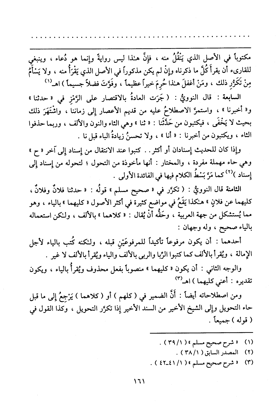 الثامنة قال النوويُّ: (تكرَّر في "صحيح مسلم" قولُه: "حدثنا فلانٌ وفلانٌ، كليهما عن فلانٍ": هكذا يَقَعُ في مواضع كثيرة في أكثر الأصول "كليهما" بالياء، وهو مما يُستشكل من جهة العربية، وحَقُّه أنْ يُقال: "كلاهما" بالألف، ولكن استعماله بالياء صحيح، وله وجهان:
