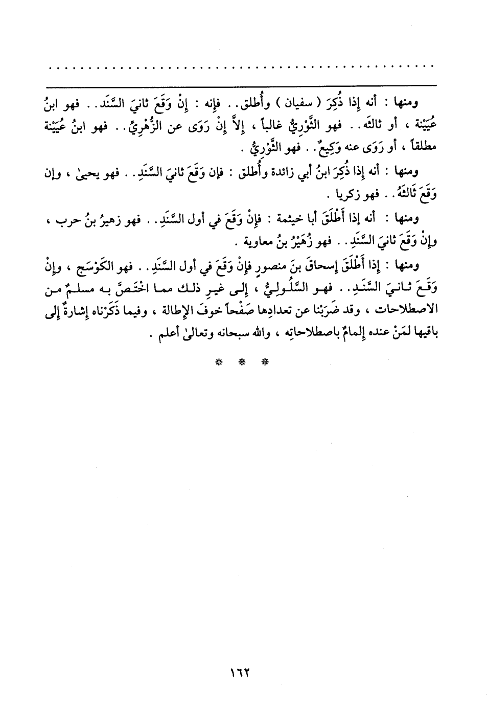 ومنها: أنه إِذا ذُكِرَ (سفيان) وأُطلق .. فإِنه: إِنْ وَقَعَ ثانيَ السَّنَد .. فهو ابنُ عُيَينة، أو ثالثَه .. فهو الثَّوْرِيُّ غالبًا، إلا إِنْ رَوَى عن الزُّهْرِيِّ .. فهو ابنُ عُيَينة مطلقًا، أو رَوَى عنه وَكيعٌ .. فهو الثَّوْرِيُّ.