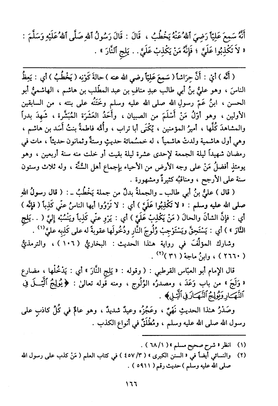 أَنَّهُ سَمِعَ عَلِيًّا رَضِيَ اللهُ عَنْهُ يَخْطُبُ، قَال: قَال رَسُولُ اللهِ صَلَّى اللهُ عَلَيهِ وَسَلَّمَ: "لا تَكْذِبُوا عَلَيَّ؛ فَإِنَّهُ مَنْ يَكْذِبْ عَلَيَّ .. يَلِجِ النَّارَ"