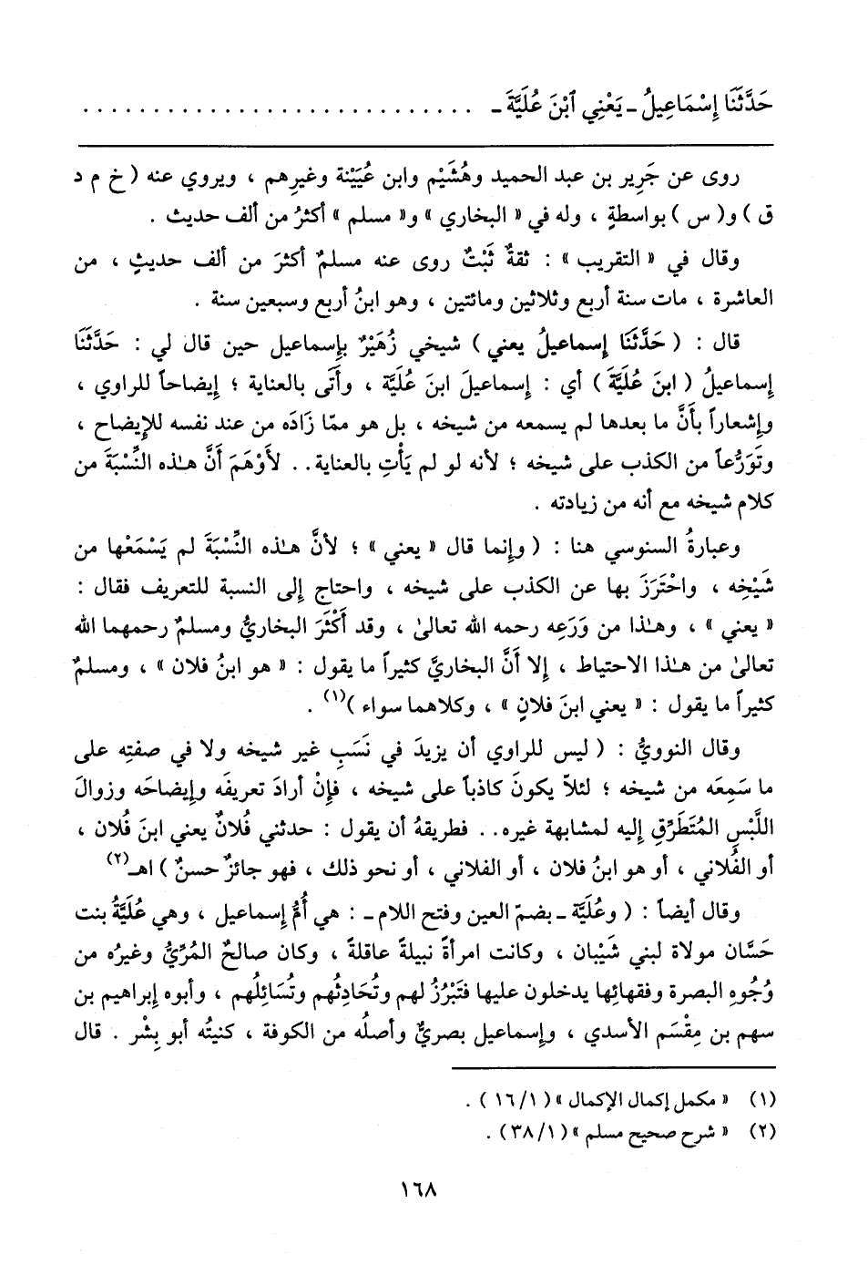 قال: (حَدَّثنَا إسماعيلُ يعني) شيخي زُهَيرٌ بإِسماعيل حين قال لي: حَدَّثَنَا إِسماعيلُ (ابنَ عُلَيَّةَ) أي: إِسماعيلَ ابنَ عُلَيَّة، وأَتَى بالعناية؛ إِيضاحًا للراوي، وإِشعارًا بأَنَّ ما بعدها لم يسمعه من شيخه، بل هو ممّا زَادَه من عند نفسه للإِيضاح، وتَوَرُّعًا من الكذب على شيخه؛ لأنه لو لم يَأتِ بالعناية .. لأَوْهَمَ أَنَّ هذه النِّسْبَةَ من كلام شيخه مع أنه من زيادته.