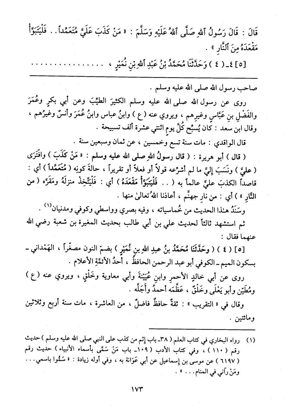 [٥] (٤) (وحَدَّثنَا مُحَمَّدُ بن عبد اللهِ بن نُمَيرٍ) بضمِّ النون مصغّرًا، الهَمْداني -بسكون الميم- الكوفي أبو عبد الرحمن الحافظ، أحدُ الأئمَّةِ الأعلام.