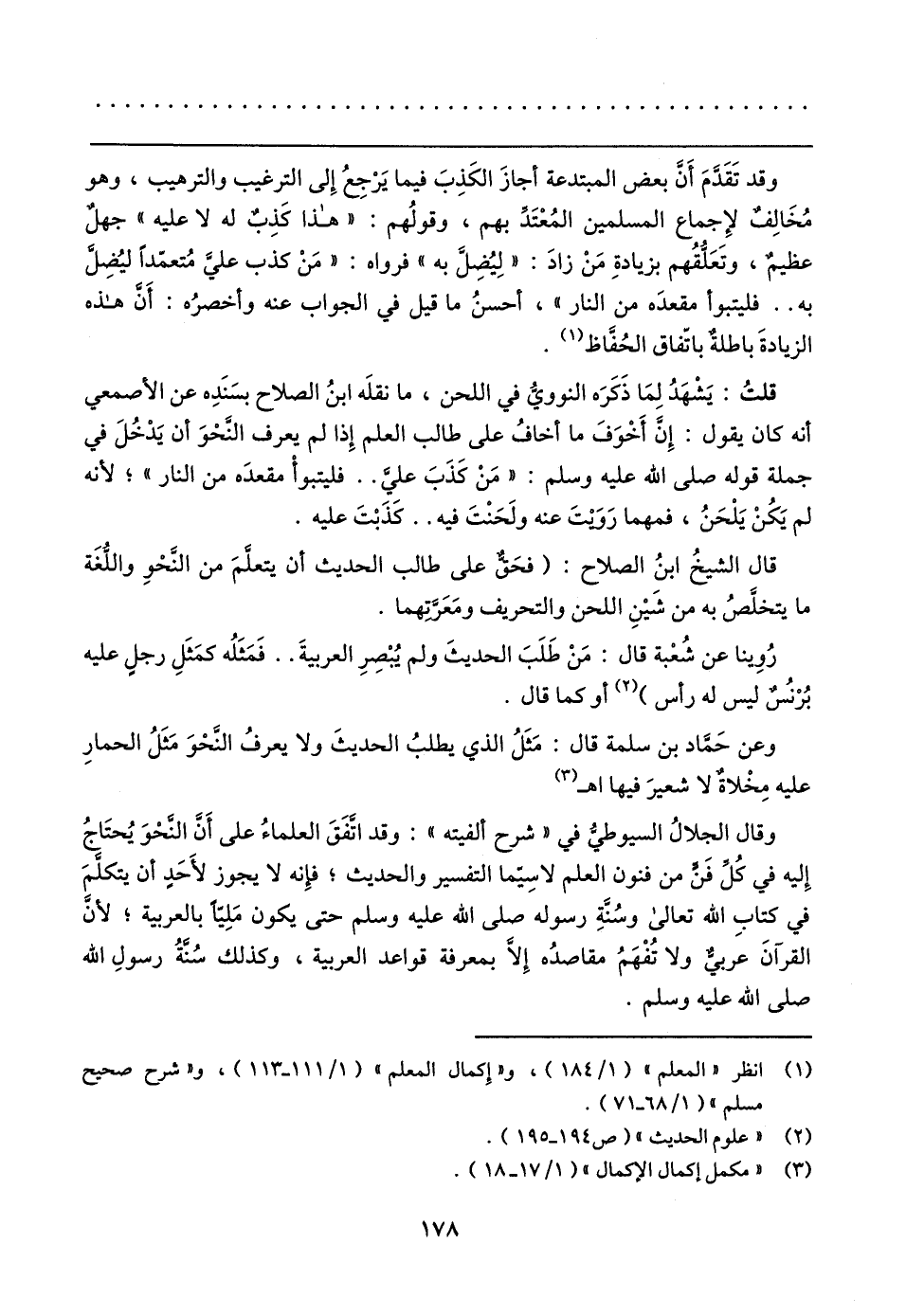 قلتُ: يَشْهَدُ لِمَا ذَكَرَه النوويُّ في اللحن، ما نقلَه ابنُ الصلاح بسَنَدِه عن الأصمعي أنه كان يقول: إِن أَخْوَفَ ما أخافُ على طالب العلم إِذا لم يعرف النَّحْوَ أن يَدْخُلَ في جملة قوله صلى الله عليه وسلم: (مَنْ كَذَبَ عليَّ .. فليتبوأْ مقعدَه من النار"؛ لأنه لم يَكُنْ يَلْحَنُ، فمهما رَويتَ عنه ولَحَنْتَ فيه .. كَذَبْتَ عليه.