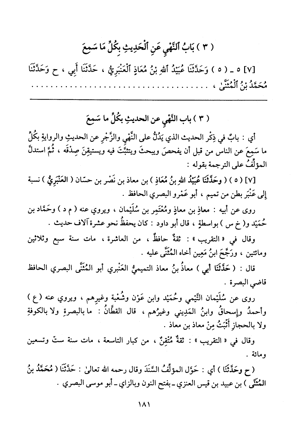[٧] (٥) (وحَدَّثنَا عُبَيدُ اللهِ بن مُعَاذِ) بن معاذ بن نَصْر بن حسّان (العَنْبَرِيُّ) نسبة إِلى عَنْبَر بطن من تميم، أبو عَمْرو البصري الحافظ.