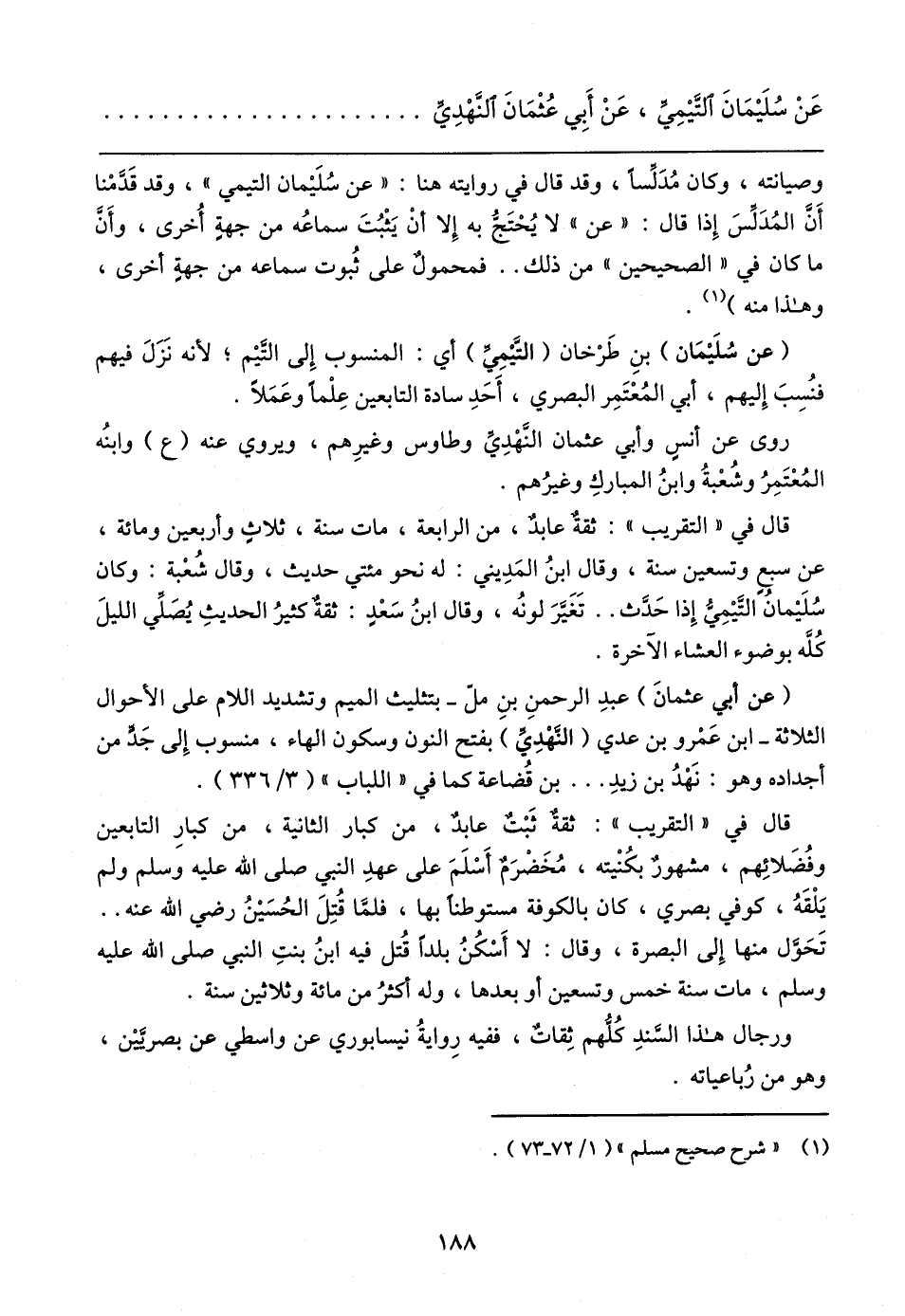 روى عن أنسٍ وأبي عثمان التهْدِفي وطاوس وغيرِهم، ويروي عنه (ع) وابنُه المُعْتَمِرُ وشُعْبةُ وابنُ المباركِ وغيرُهم.