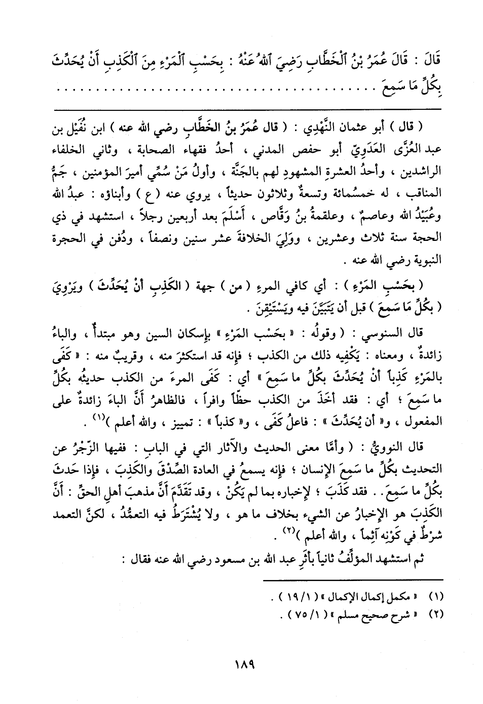 قَال: قَال عُمَرُ بْنُ الْخَطَّابِ رَضِيَ اللهُ عَنْهُ: بِحَسْبِ الْمَرْءِ مِنَ الْكَذِبِ أَنْ يُحَدِّثَ بِكُلِّ مَا سَمِعَ