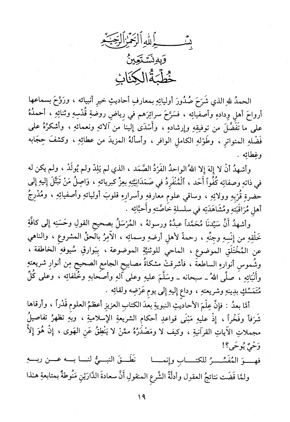 الحمدُ للهِ الذي شَرَحَ صُدُورَ أوليائِهِ بمعارفِ أحاديثِ خيرِ أنبيائه، ورَوَّحَ بسماعها أرواحَ أهلِ ودادهِ وأصفيائِه، فسَرَّحَ سرائِرَهم في رِياضِ روضةِ قُدْسِهِ وثنائِهِ، أحمدُهُ على ما تَفَضَّلَ من توفيقِهِ وإِرشادهِ، وأَسْدَى إِلينا من آلائهِ ونعمائهِ، وأشكرُهُ على فَضْلهِ المتواترِ، وطَوْلهِ الكاملِ الوافر، وأسألهُ المزيدَ من عطائِهِ، وكشفَ حِجَابه وغِطائِه.