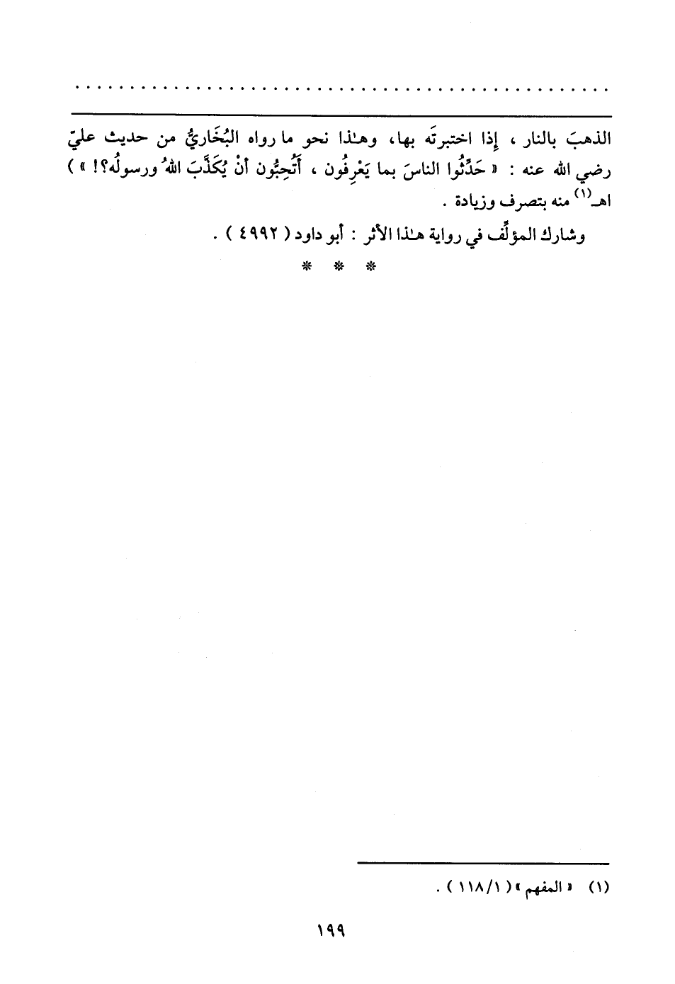 الذهبَ بالنار، إِذا اختبرتَه بها، وهذا نحو ما رواه البُخَاريُّ من حديث علي رضي الله عنه: "حَدِّثُوا الناسَ بما يَعْرِفُون، أتحِبُّون أنْ يُكَذَّبَ اللهُ ورسولُه؟ ! ") اهـ (١) منه بتصرف وزيادة.