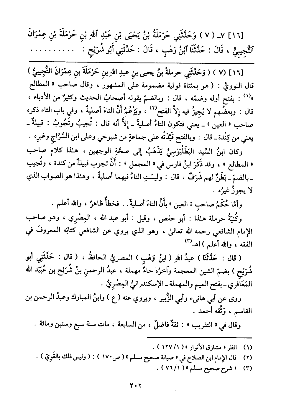 [١٦] (٧) (وَحَدَّثَنِي حرملةُ بن يحيى بنِ عبد اللهِ بنِ حَرْمَلَةَ بنِ عِمْرَانَ التُّجِيبيُّ) قال النوويُّ: (هو بمثناة فوقية مضمومة على المشهور، وقال صاحب "المطالع" (١): بفتح أوله وضمّه، قال: وبالضمّ يقوله أصحابُ الحديث وكثيرٌ من الأدباء، قال: وبعضُهم لا يُجِيزُ فيه إلا الفتح (٢)، ويَزْعُمُ أَن التاءَ أصليةٌ، وفي باب التاء ذكره صاحب "العين" -يعني فتكون التاءُ أصليةً- إلا أنه قال: تُجيبُ وتَجُوبُ: قبيلة -يعني من كِنْدة- قال: وبالفتح قَيَّدْتُه على جماعةٍ من شيوخي وعلى ابن السَّرَّاجِ وغيرِه.