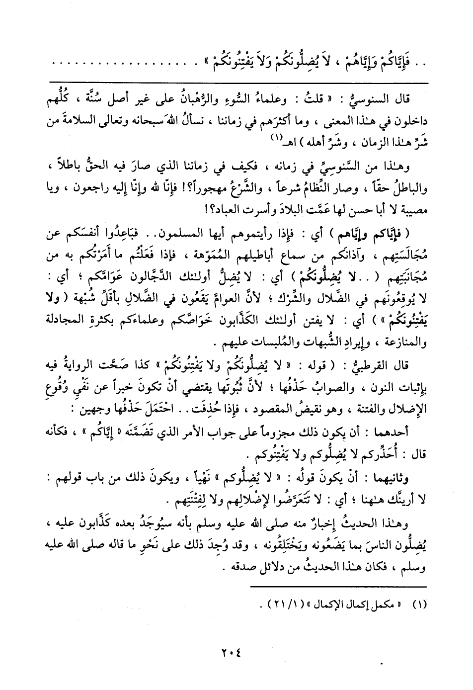 قال السنوسيُّ: "قلتُ: وعلماءُ السُّوءِ والرُّهْبانُ على غير أصل سُنَّة، كُلُّهم داخلون في هذا المعنى، وما أكثرَهم في زماننا، نسألُ اللهَ سبحانه وتعالى السلامةَ من شَرِّ هذا الزمان، وشَرِّ أهله) اهـ (١)