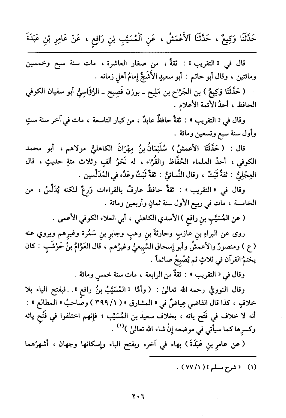 وقال النوويُّ رحمه الله تعالى: (وأمَّا "المُسَيَّبُ بن رافعٍ" .. فبفتح الياء بلا خلافٍ، كذا قال القاضي عِياضٌ في "المشارق" (١/ ٣٩٩) وصاحبُ "المطالع": أنه لا خلاف في فَتْح يائه، بخلاف سعيد بن المُسَيِّب؛ فإنهم اختلفوا في فَتْحِ يائه وكسرِها كما سيأتي في موضعه إِنْ شاء الله تعالى) (١).