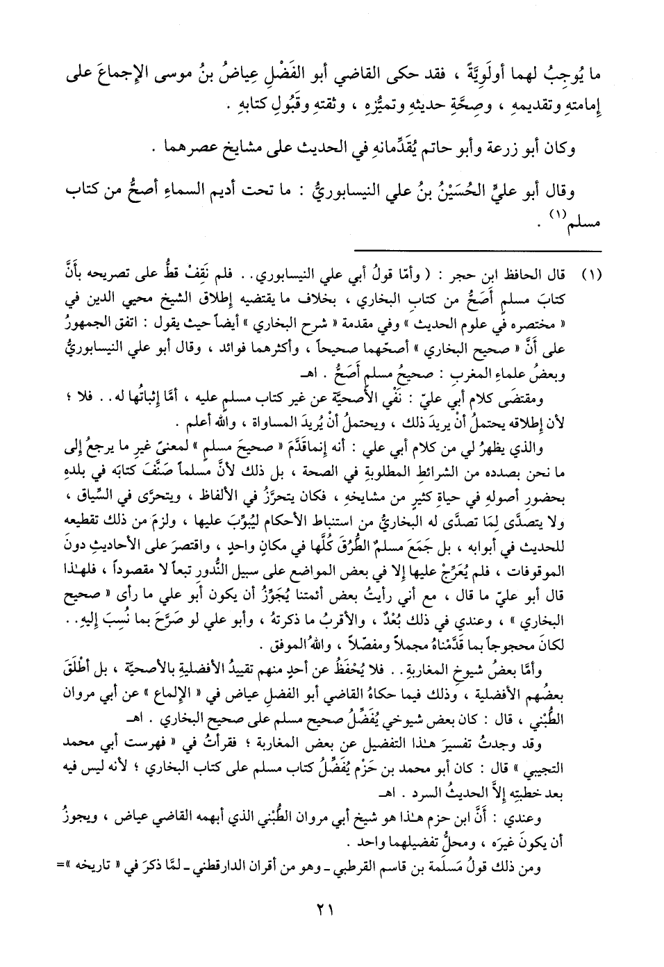 ما يُوجِبُ لهما أولَويَّةً، فقد حكى القاضي أبو الفَضْلِ عِياضُ بن موسى الإِجماعَ على إِمامتهِ وتقديمهِ، وصِحَّةِ حديثهِ وتميُّزهِ، وثقتهِ وقَبُولِ كتابهِ.