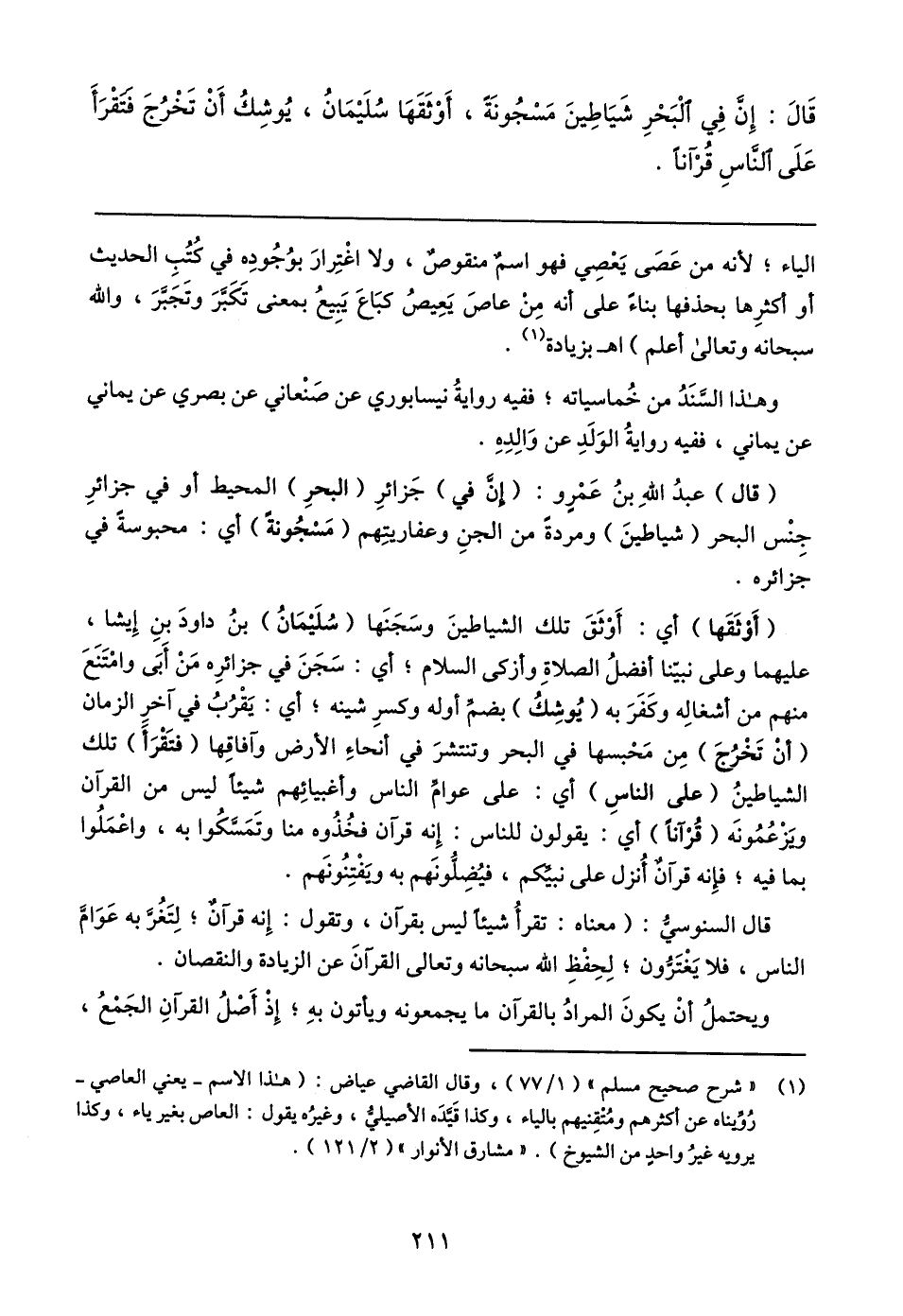 قَال: إِنَّ فِي الْبَحْرِ شَيَاطِينَ مَسْجُونَةً، أَوْثَقَهَا سُلَيمَانُ، يُوشِكُ أَنْ تَخْرُجَ فتقْرَأَ عَلَى النَّاسِ قُرْآنًا