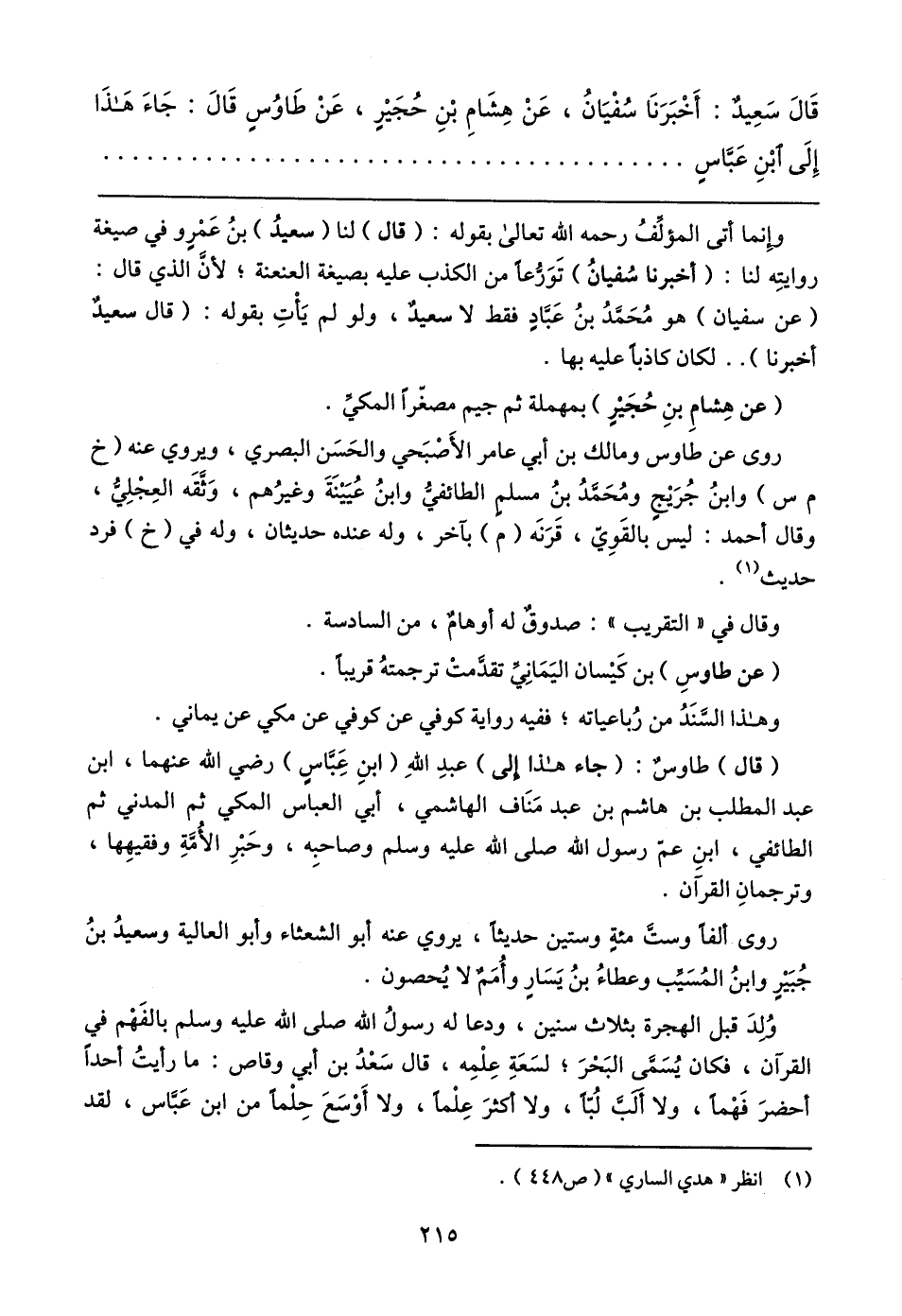 قَال سَعِيدٌ: أَخْبَرَنَا سُفْيَانُ، عَنْ هِشَامِ بْنِ حُجَيْرٍ، عَنْ طَاوُسٍ قَال: جَاءَ هَذَا إِلَى ابْنِ عَباسٍ