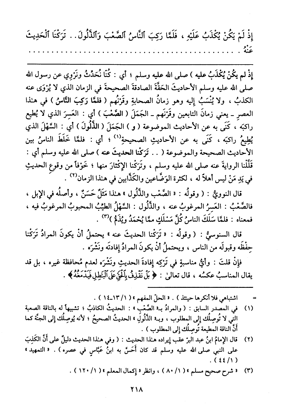 (١) في المصدر السابق: (والمرادُ بـ (الصَّعْبِ": الحديثُ الكاذبُ؛ تشبيهًا له بالناقة الصعبة التي لا تُوصِلُك إلى المطلوب، وبـ "الذَّلُولَ" الحديثُ الصحيحُ؛ لأنه يُوصِلُك إِلى الجنَّة كما أَنَّ الناقة المطيعة تُوصِلُك إلى المطلوب).