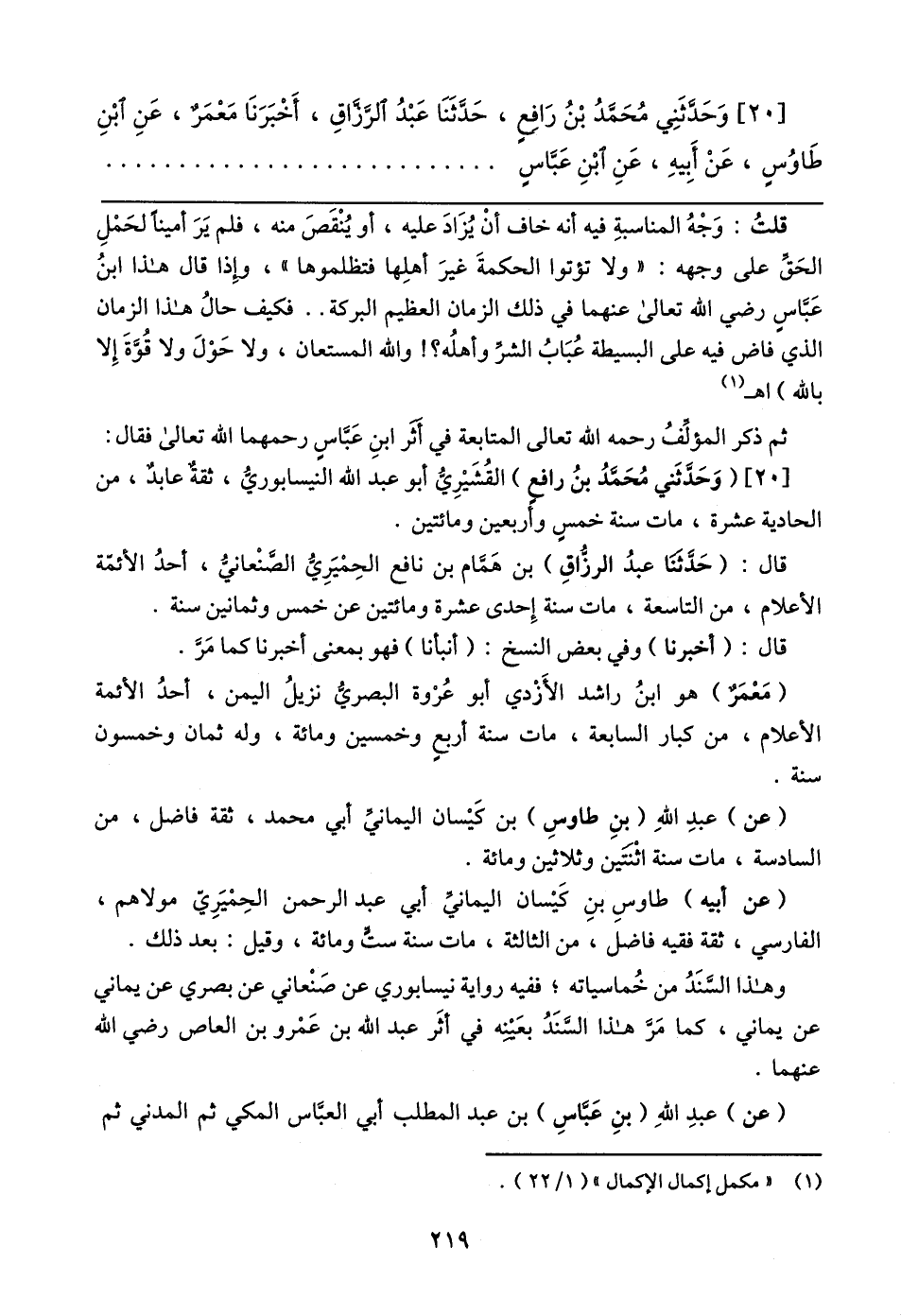 ثم ذكر المؤلِّفُ رحمه الله تعالى المتابعة في أثَر ابنِ عَبَّاسٍ رحمهما الله تعالى فقال: [٢٠] (وَحَدَّثَني مُحَمَّدُ بن رافعٍ) القُشَيرِيُّ أبو عبد الله النيسابوريُّ، ثقةٌ عابدٌ، من الحادية عشرة، مات سنة خمسٍ وأربعين ومائتين.
