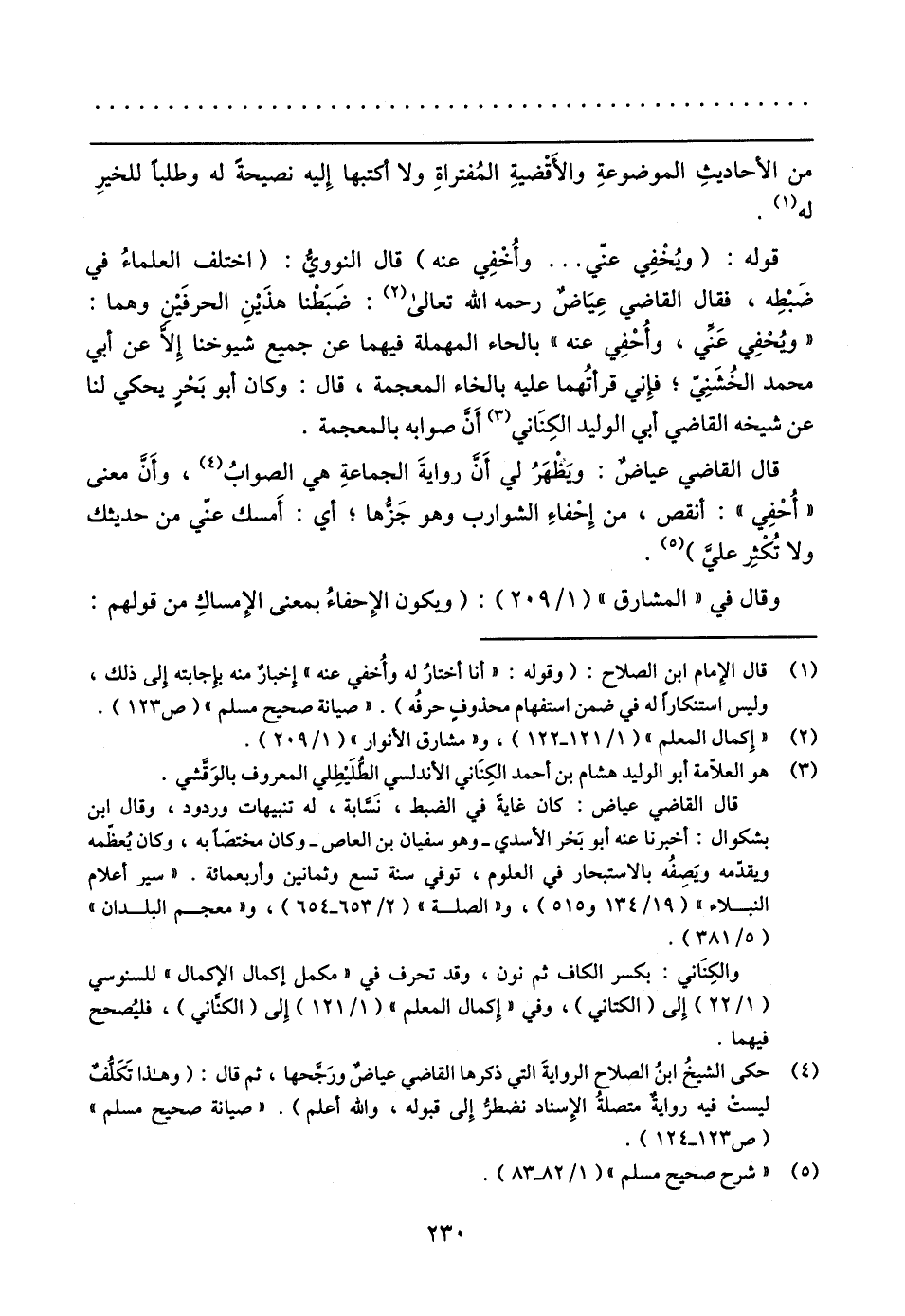 (٤) حكى الشيخُ ابنُ الصلاح الروايةَ التي ذكرها القاضي عياضٌ ورَجَّحها، ثم قال: (وهذا تَكَلُّفٌ ليستْ فيه روايةٌ متصلةُ الإِسناد نضطرُّ إِلى قبوله، والله أعلم). "صيانة صحيح مسلم" (ص ١٢٣ - ١٢٤).