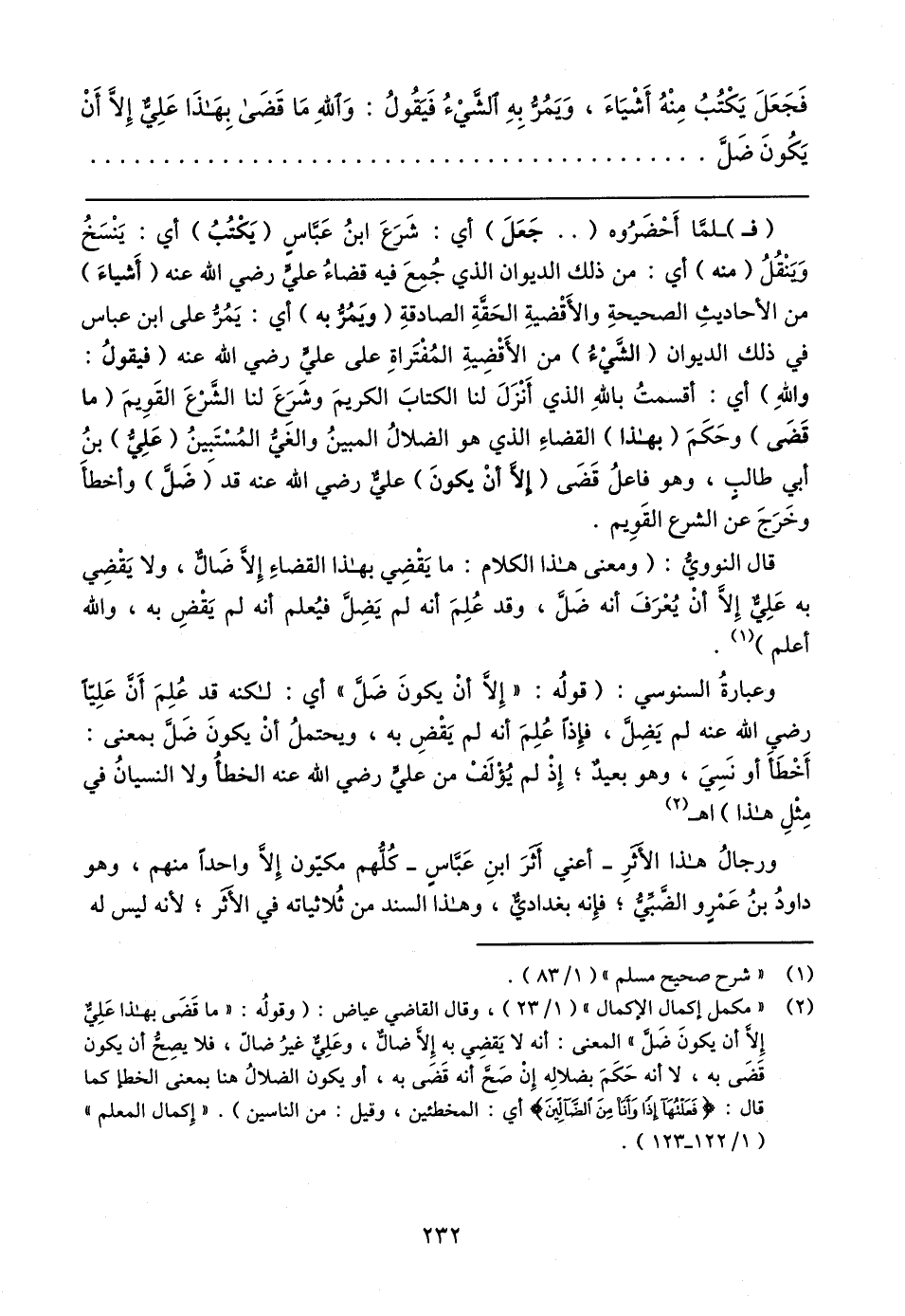 (٢) "مكمل إكمال الإكمال" (١/ ٢٣)، وقال القاضي عياض: (وقولُه: "ما قَضَى بهذا عَلِيٌّ إلا أن يكونَ ضَلَّ" المعنى: أنه لا يَقضِي به إلَّا ضالٌّ، وعَلِي غيرُ ضالّ، فلا يصِحُّ أن يكون قَضى به، لا أنه حَكَمَ بضلالِه إِنْ صَحَّ أنه قَضَى به، أو يكون الضلالُ هنا بمعنى الخطإ كما قال: {فَعَلْتُهَا إِذًا وَأَنَا مِنَ الضَّالِّينَ} أي: المخطئين، وقيل: من الناسين). "إِكمال المعلم" (١/ ١٢٢ - ١٢٣).