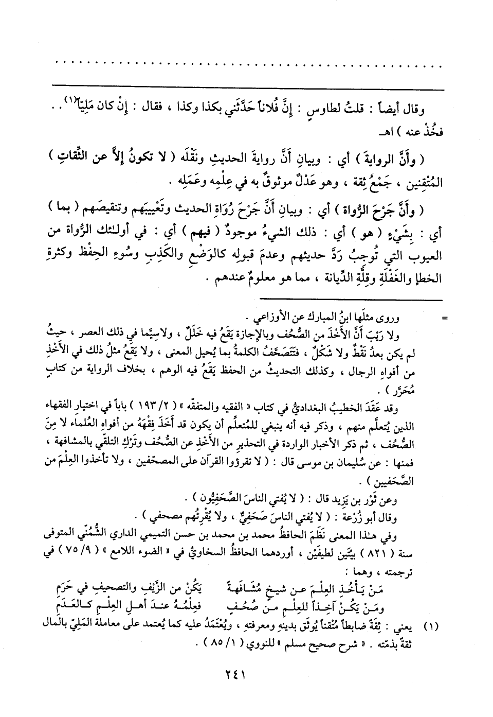 (١) يعني: ثِقَةً ضابطًا مُتْقنًا يُوثَق بدينهِ ومعرفتهِ، ويُعْتَمَدُ عليه كما يُعتمد على معاملة المَلِيّ بالمال ثقةً بذمّته. "شرح صحيح مسلم" للنووي (١/ ٨٥).