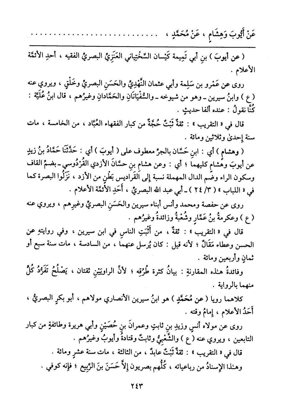 كلاهما رويا (عن مُحَمَّدٍ) هو ابنُ سيرين الأنصاري مولاهم، أبو بكرٍ البصريُّ، أَحَدُ الأعلام، إِمامُ وقته.