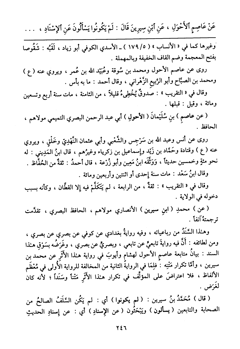 عَنْ عَاصِمٍ الأَحْوَلِ، عَنِ ابْنِ سِيرِينَ قَال: لَمْ يَكُونُوا يَسْأَلونَ عَنِ الإِسْنَادِ،
