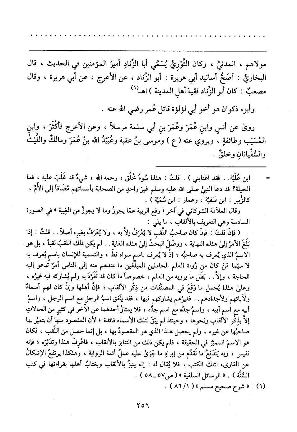 (فإنْ قلتَ: فإنْ كان صاحبُ اللقب لا يُعْرَفُ إلا به، ولا يُعْرَفُ بغيرِه أصلًا .. قلتُ: إذا بَلَغَ الأمرُ إلى هذه النهاية، ووصَلَ البحَثُ إلى هذه الغاية .. لم يكن ذلك اللقبُ لقبًا، بل هو الاسمُ الذي يُعرف به صاحبُه؛ إذْ لا يُعرف باسم سواه قط، والتسمية للإنسان باسم يُعرف به لا سيما مَنْ كان من رُواة العلم الحاملين المبلغين ما عندهم منه إلى الناس أمرٌ تدعو إليه الحاجة، وإلا .. بَطَل ما يرويه من العلم، خصوصًا ما كان قد تَفَردَ به ولم يُشاركه فيه غيرُه، وعلى هذا يُحمل ما وَقَعَ في المصنفات من ذِكْر الألقاب؛ فإن أهلها وإنْ كان لهم أسماءٌ ولآبائهم ولأجدادهم .. فغيرُهم يشاركهم فيها، فقد يتفق اسمُ الرجل مع اسم الرجل، واسمُ أبيه مع اسم أبيه، واسمُ جده مع اسم جده، فلا يمتازُ أحدهما عن الآخر في كثير من الحالاتِ إلا بذِكْر الألقاب ونحوها، وحينئذ لم يبْقَ لتلك الأسماء فائدة؛ لأن المقصود منها أن يتميز بها صاحبُها عن غيره، ولم يحصل هذا الذي هو المقصودُ بها، بل إنما حصل من اللقب، فكان هو الاسمَ المميز في الحقيقة، فلم يكن ذلك من التنابز بالألقاب، فاعْرِفْ هذا وتدَبَّرْه؛ فإنه نفيس، وبه يَنْدَفع ما تَقدَّم من إيرادِ ما جَرَى عليه عملُ أئمة الرواية، وهكذا يرتفعُ الإشكالُ عن القارئ لتلك الكتب، فلا يُقال له: إنه ينبزُ بالألقاب ويغتابُ أهلها بقراءتها في كتب السُّنَّة). "الرسائل السلفية" (ص ٥٧ - ٥٨).