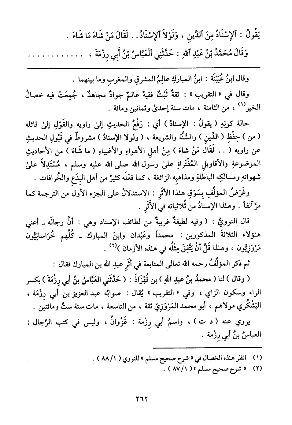 قال النووي: (وفيه لطيفةٌ غريبةٌ من لطائف الإسناد وهي: أن رجاله -أعني هؤلاء الثلاثةَ المذكورين: محمدًا وعَبْدان وابنَ المبارك- كلهم خُرَاسانِيون مَرْوَزِيُّون، وهذا قَل أنْ يَتفِقَ مِثْلُه في هذه الأزمان) (٢).
