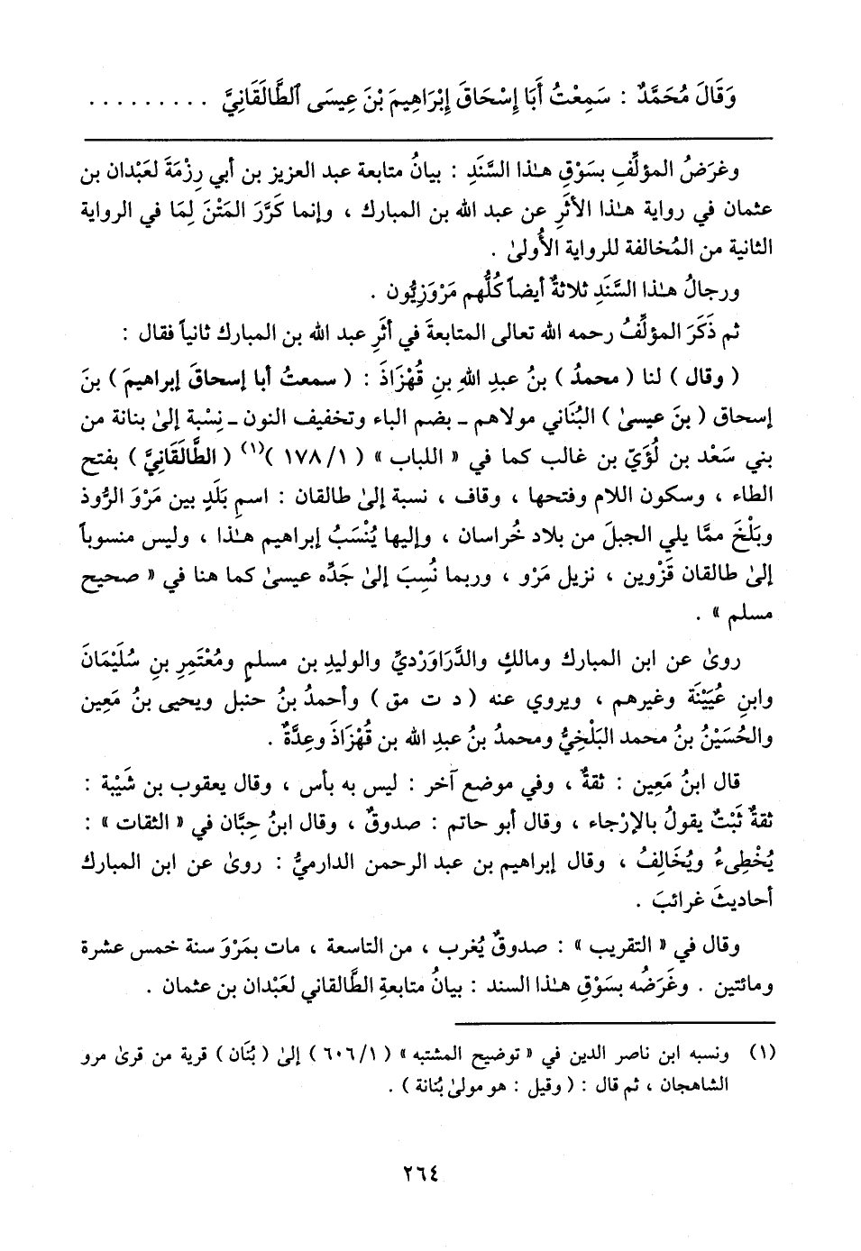 ثم ذَكَرَ المؤلِّفُ رحمه الله تعالى المتابعةَ في أثَرِ عبد الله بن المبارك ثانيًا فقال: