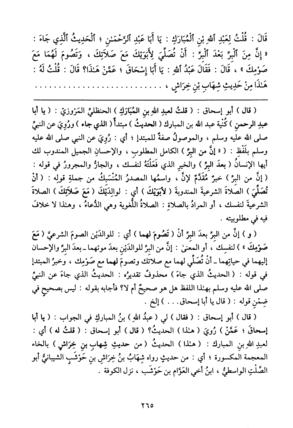 قَال: قُلْتُ لِعَبْدِ اللهِ بْنِ الْمُبَارَكِ: يَا أَبَا عَبْدِ الرحْمنِ؛ الْحَدِيثُ الذِي جَاءَ: "إِن منَ الْبِرِّ بَعْدَ الْبِرِّ: أَنْ تُصَلِّيَ لِأَبَوَيكَ مَعَ صَلاتِكَ، وَتَصُومَ لَهُمَا مَعَ صَوْمِكَ"، قَال: فَقَال عَبْدُ اللهِ: يَا أَبَا إسْحَاقَ؛ عَمنْ هَذَا؟ قَال: قُلْتُ لَهُ: هَذَا مِنْ حَدِيثِ شِهَابِ بْنِ خِرَاشٍ،