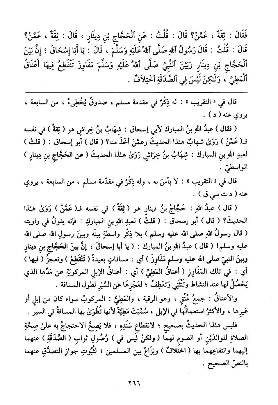 (قال) عبدُ اللهِ: حَجَّاجُ بن دينارٍ هو (ثِقَةٌ) في نفسه فـ (عَمَّنْ) رَوَى هذا الحديثَ؟ (قال) أبو إسحاق: (قلتُ) لعبدِ اللهِ بنِ المباركِ: فإنه يقولُ في راويته (قال رسولُ اللهِ صلى الله عليه وسلم) بلا ذِكْر واسطةٍ بينَه وبينَ رسولِ الله صلى الله عليه وسلم! (قال) عبدُ اللهِ بن المبارك: (يا أبا إسحاقَ؛ إن بينَ الحَجاج بن دينارِ وبينَ النبي صلى الله عليه وسلم مَفَاوزَ) أي: مسافاتٍ بعيدةً (تَنْقَطعُ) وتعجزَ (فيها) أي: في تلك المَفَاوزِ (أعناقُ المَطِي) أي: أعناقُ الإبلِ المركوبَةِ عن مَدِّها الذي يَحْصُلُ لها عند النشاط وتَنْثَنِي وَتعْطِفُ؛ لعَجْزِهَا عن السيرِ لطول المسافة.