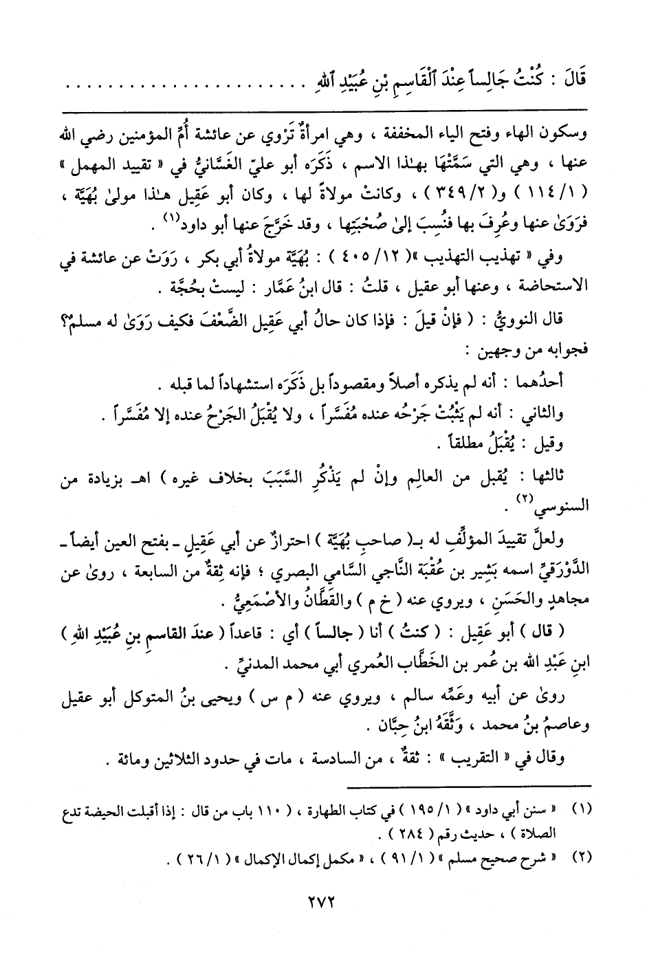 وسكون الهاء وفتح الياء المخففة، وهي امرأة تَرْوي عن عائشة أُم المؤمنين رضي الله عنها، وهي التي سَمَّتْهَا بهذا الاسم، ذَكَرَه أبو علي الغَسَّاني في "تقييد المهمل" (١/ ١١٤) و (٢/ ٣٤٩)، وكانتْ مولاةً لها، وكان أبو عَقِيل هذا مولى بُهَيَّة، فرَوَى عنها وعُرِفَ بها فنُسِبَ إلى صُحْبَتِها، وقد خَرجَ عنها أبو داود (١).