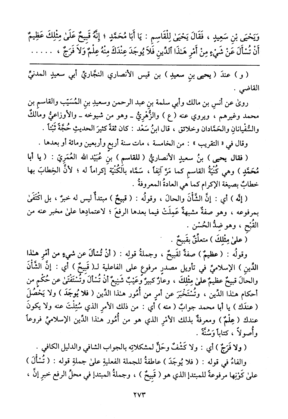 وَيَحْيَى بْنِ سَعِيدٍ، فَقَال يَحْيَى لِلْقَاسِمِ: يَا أَبَا مُحَمَّدٍ؛ إِنهُ قَبِيحٌ عَلَى مِثْلِكَ عَظِيمٌ أَنْ تُسْألَ عَنْ شَيءٍ مِنْ أَمْرِ هَذَا الدِّينِ فَلَا يُوجَدَ عِنْدَكَ مِنْهُ عِلْمٌ وَلَا فَرَجٌ،