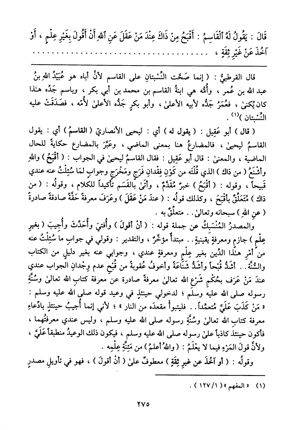 قَال: يَقُولُ لَهُ الْقَاسِمُ: أَقْبَحُ مِنْ ذَاكَ عِنْدَ مَنْ عَقَلَ عَنِ اللهِ أَنْ أَقُولَ بِغَيرِ عِلْم، أَوْ آخُذَ عَنْ غَيرِ ثِقَةٍ،