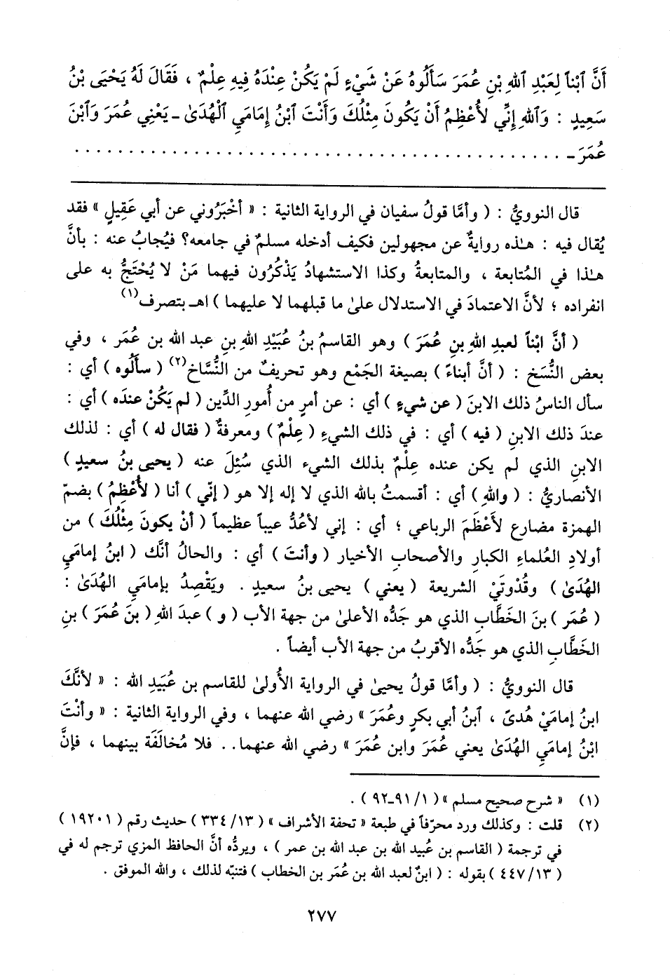 قال النووي: (وأما قولُ يحيى في الرواية الأُولى للقاسم بن عُبَيدِ الله: "لأنَّكَ ابنُ إمامَي هُدىً، ابنُ أبي بكرٍ وعُمَرَ" رضي الله عنهما، وفي الرواية الثانية: "وأنْتَ ابْنُ إمامَيِ الهُدَى يعني عُمَرَ وابن عُمَرَ" رضي الله عنهما .. فلا مُخالفَة بينهما، فإن