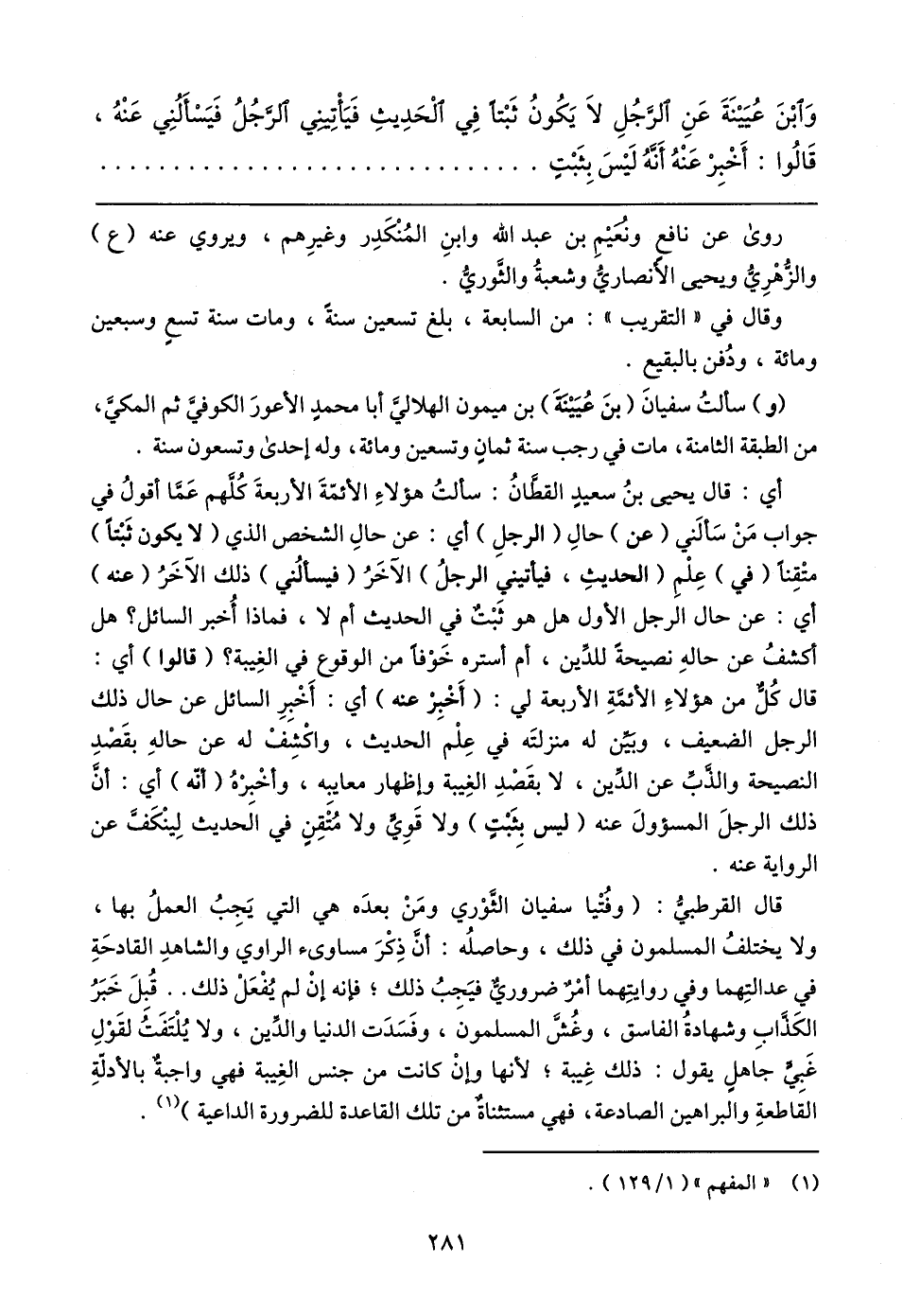 (و) سألتُ سفيانَ (بنَ عُيَينةَ) بن ميمون الهلالي أبا محمدٍ الأعورَ الكوفي ثم المكي، من الطبقة الثامنة، مات في رجب سنة ثمانٍ وتسعين ومائة، وله إحدى وتسعون سنة.