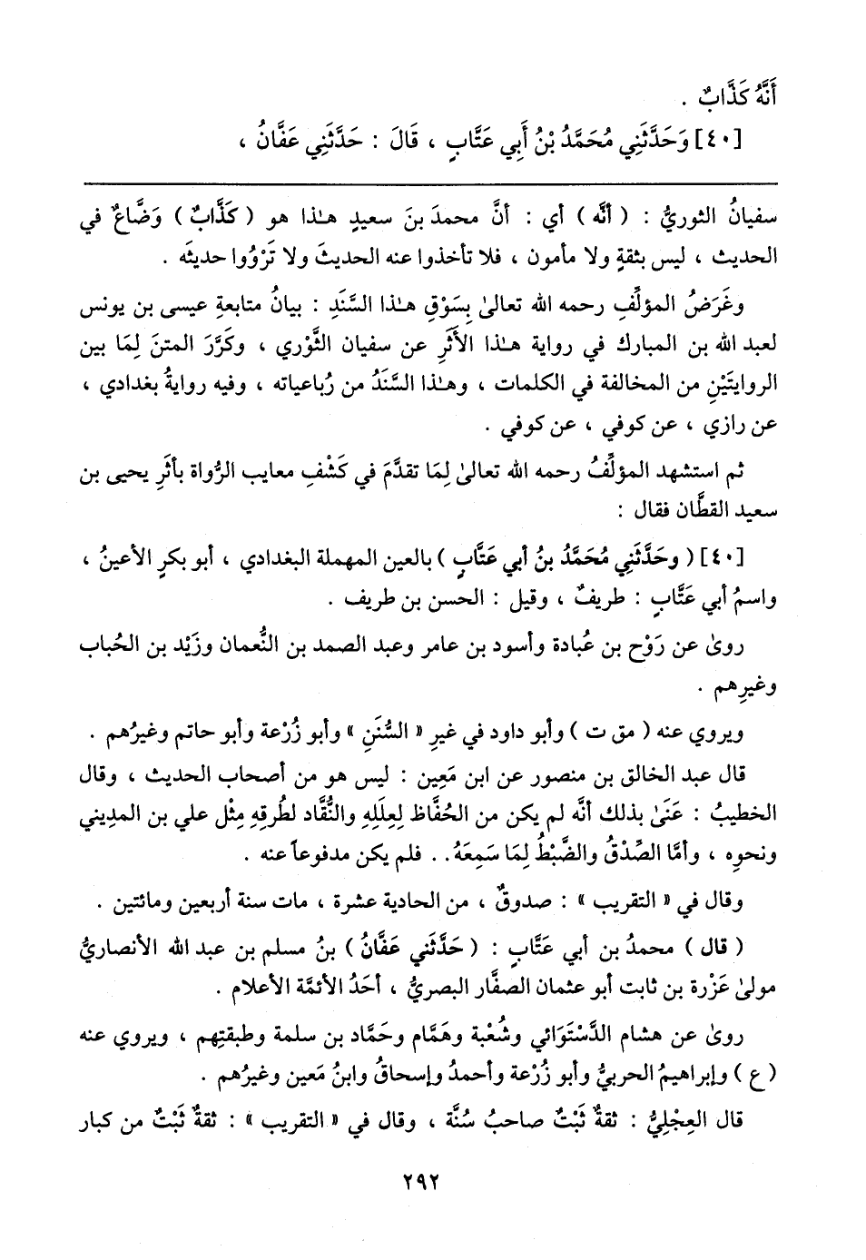 سفيانُ الثوريُّ: (أنه) أي: أن محمدَ بنَ سعيدٍ هذا هو (كَذاب) وَضَّاعٌ في الحديث، ليس بثقةٍ ولا مأمون، فلا تأخذوا عنه الحديثَ ولا تَرْوُوا حديثَه.