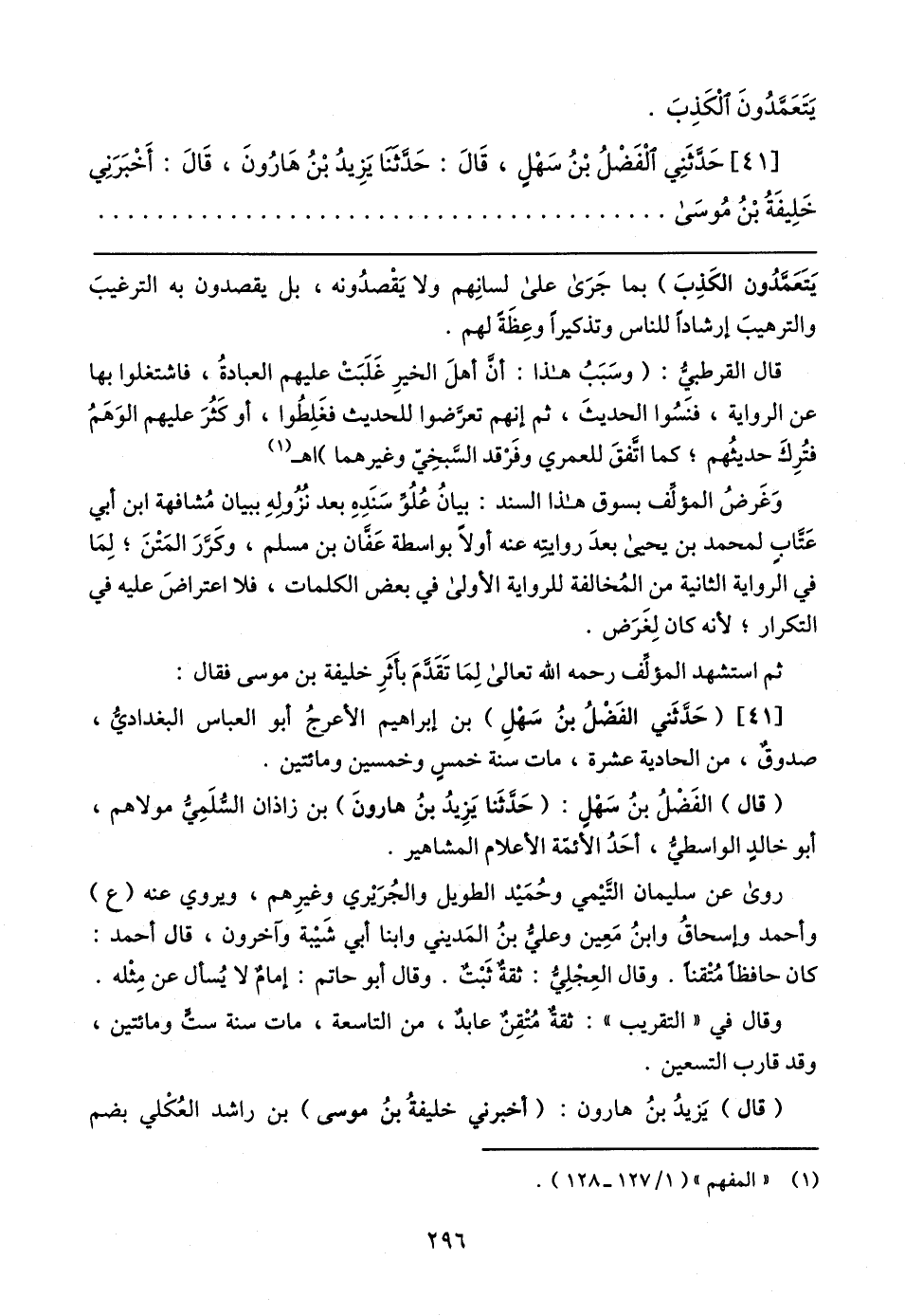 [٤١] حَدَّثَني الْفَضْلُ بْنُ سَهْلٍ، قَال: حَدثنا يَزيدُ بْنُ هَارُونَ، قَال: أَخْبَرَني خَليفَةُ بْنُ مُوسَى
