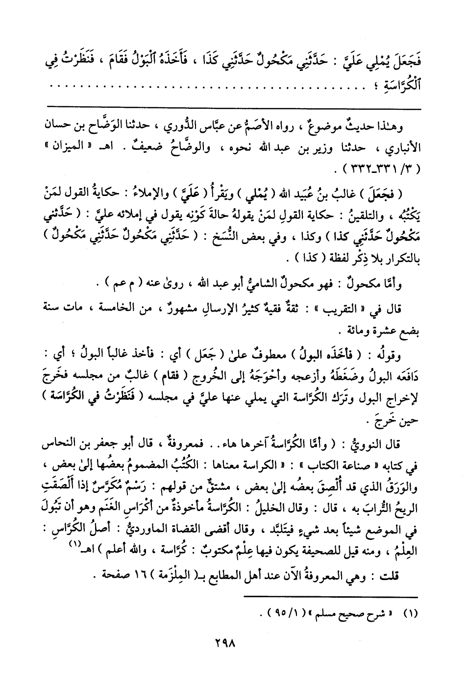 فَجَعَلَ يُمْلي عَلَيَّ: حَدَّثَني مَكْحُولٌ حَدَّثَني كَذَا، فَأخَذَهُ الْبَوْلُ فَقَامَ، فَنَظَرْتُ في الْكُراسَة؛