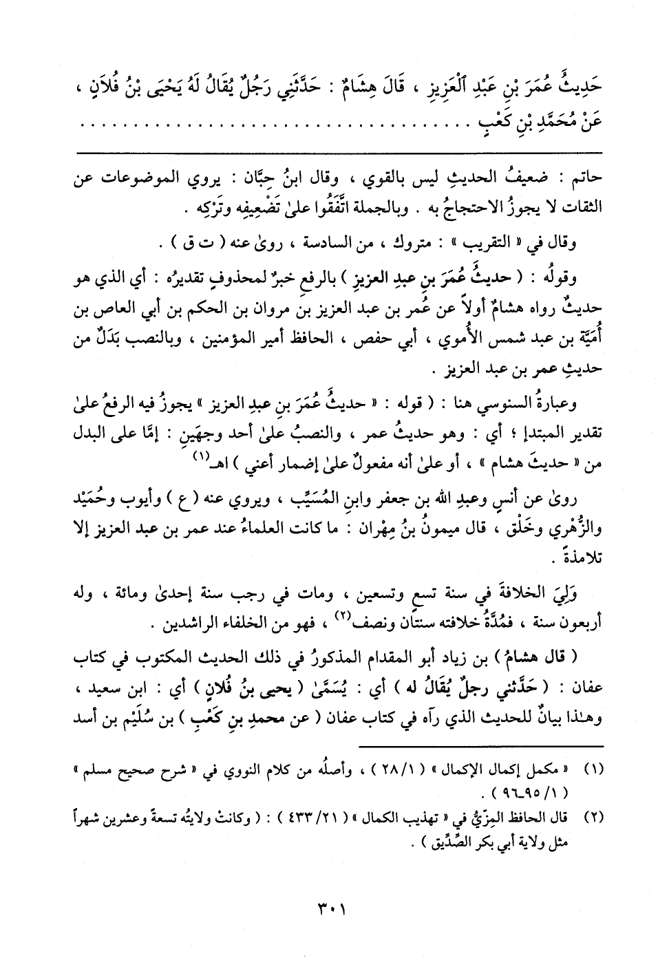 وعبارةُ السنوسي هنا: (قوله: "حديثُ عُمَرَ بنِ عبد العزيز" يجوزُ فيه الرفعُ على تقدير المبتدإ؛ أي: وهو حديثُ عمر، والنصبُ على أحد وجهَينِ: إمَّا على البدل من "حديثَ هشام"، أو على أنه مفعولٌ على إضمار أعني) اهـ (١)