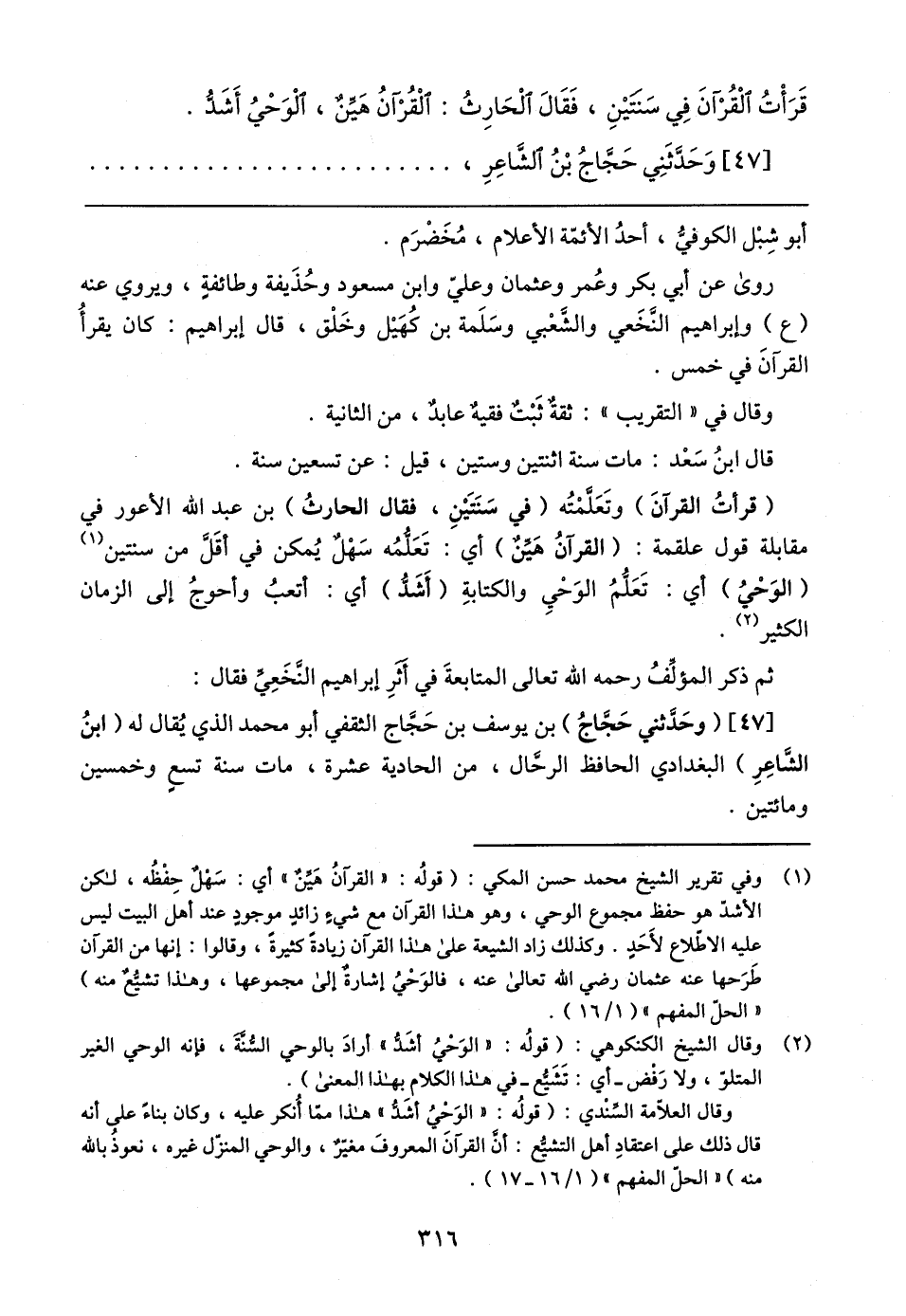 قَرَأْتُ الْقُرآنَ في سَنتَينِ، فَقَال الْحَارِثُ: الْقُرآنُ هَيِّنٌ، الْوَحْيُ أَشَدُّ.
