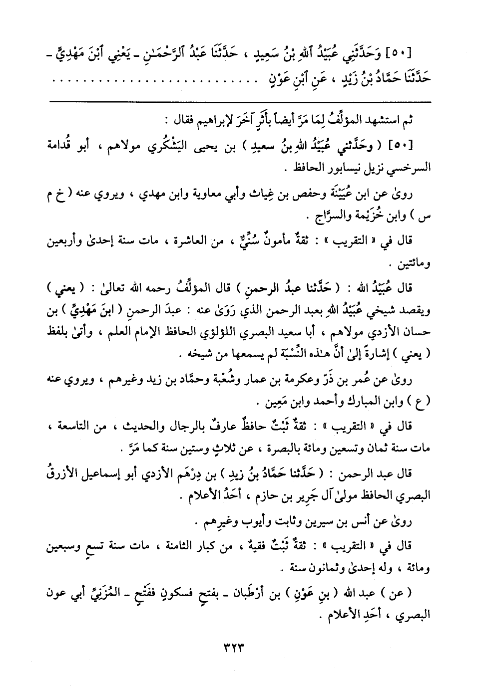 [٥٠] وَحَدَّثَنِي عُبَيدُ الله بْنُ سَعِيدٍ، حَدَّثَنَا عَبْدُ الرَّحْمَنِ -يَعْنِي ابْنَ مَهْدِيّ- حَدَّثَنَا حَمَّادُ بْنُ زَيدٍ، عَنِ ابْنِ عَوْنٍ